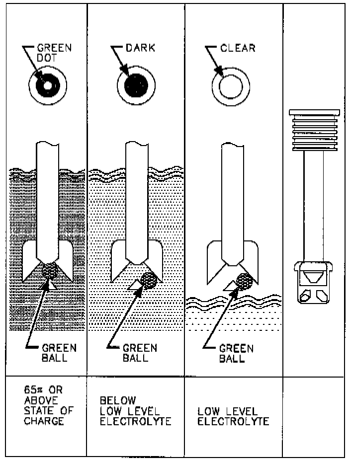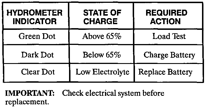 Note: Before determining that the battery needs to be replaced, lightly tap the eye of the hydrometer to ensure that gas bubbles have not lodged themselves in the hydrometer. If the battery needs replacement, check the charging system for proper operation.