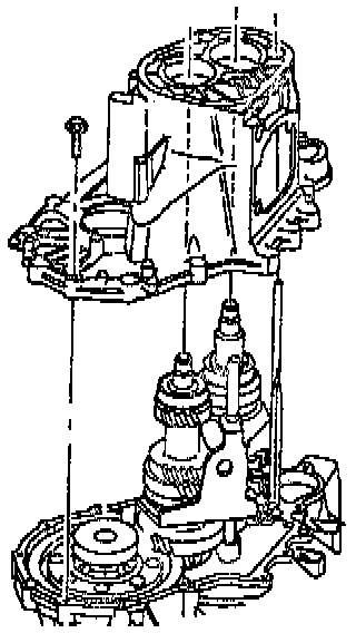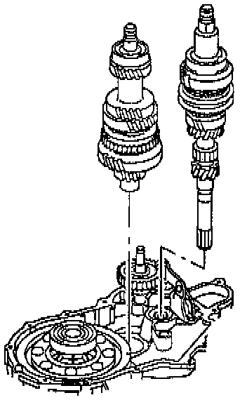 15. Install input and output shafts. Lift shafts and mesh gears together. Lower the shafts together and rotate back and forth to align with differential ring gear and start the output shaft in its bearing.