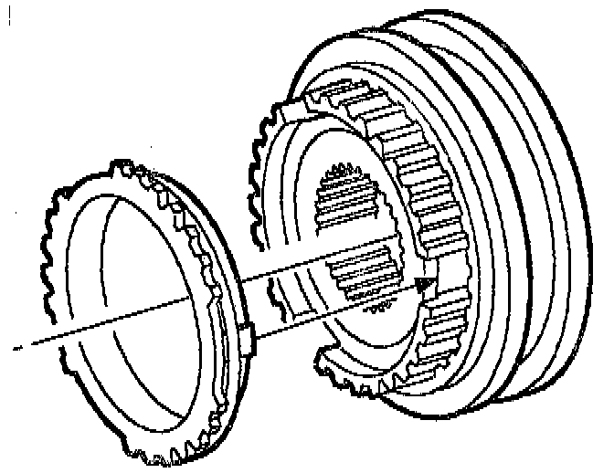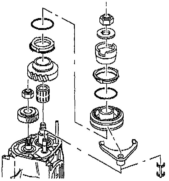 40. Install the 5th/reverse hub to the input shaft. If the 5th/reverse hub does easily install onto the input shaft refer to "5th Driven Gear-Press Fit Installation" procedures.