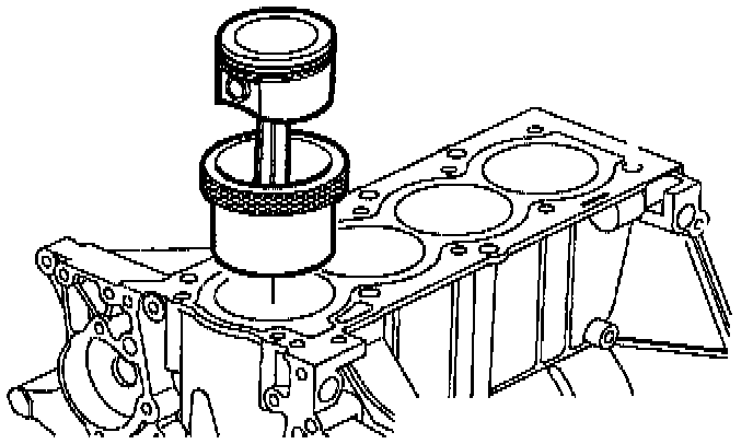 b. Using the piston ring compressor service tool SA9142E, push the correct piston and connecting rod assembly into each cylinder with the mark on the piston facing forward.
