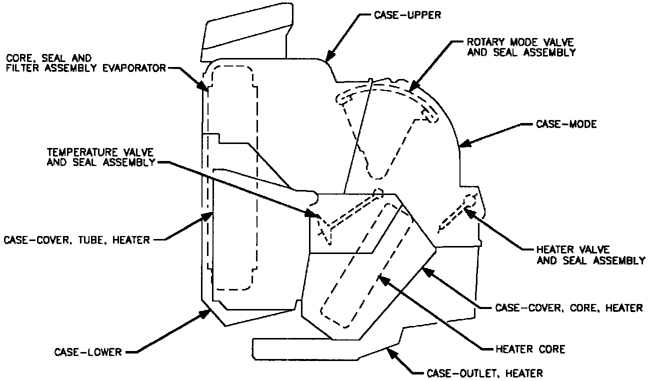 Contains heater tube case cover, Blower Motor, Temperature Valve and seal assembly, Evaporator Core and filter assembly.