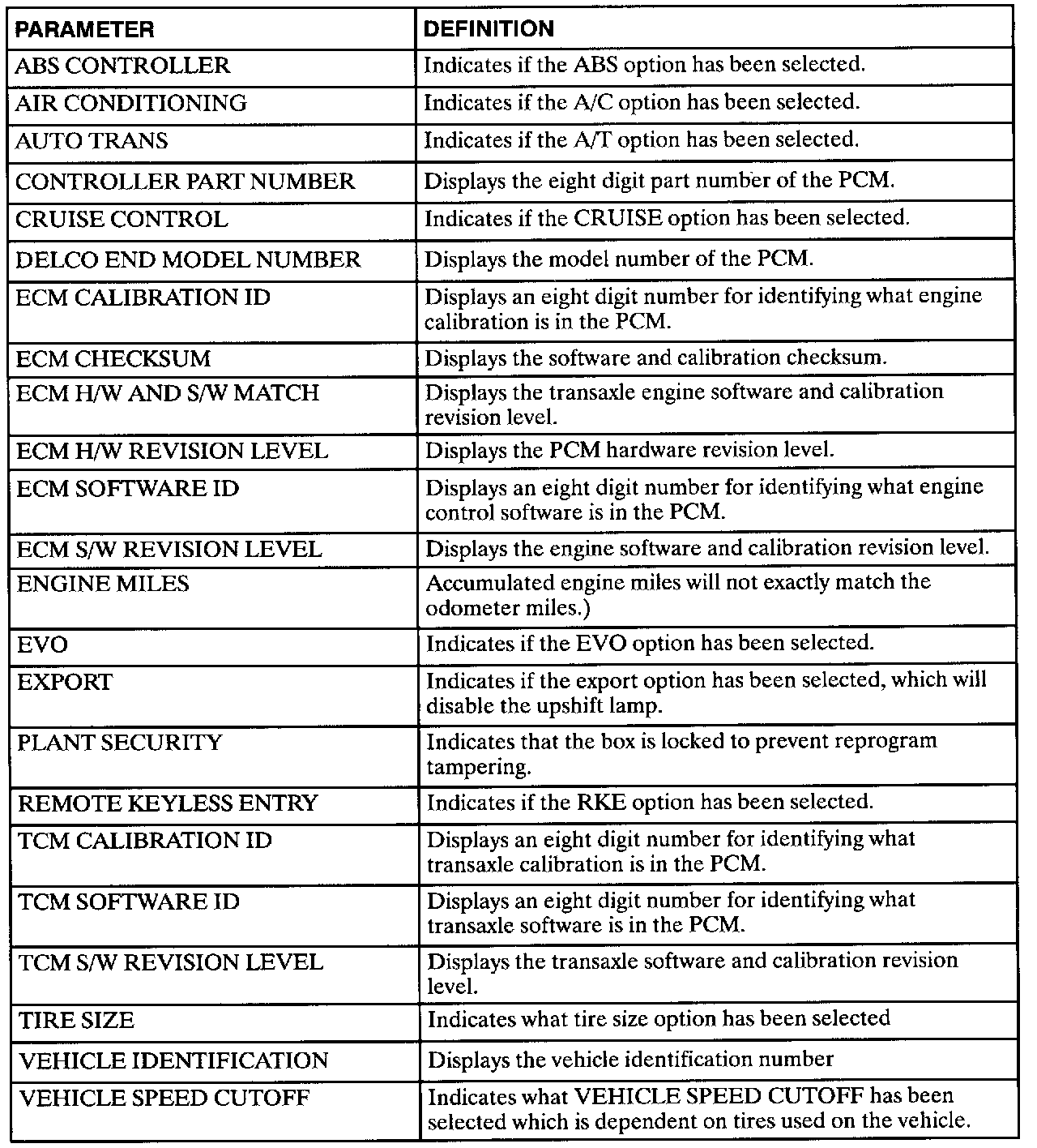 The scan tool displays data in several different "tables". Data from a single component is some times displayed in multiple tables. Here is an index for the available tables followed by the actual scan tool data definitions: