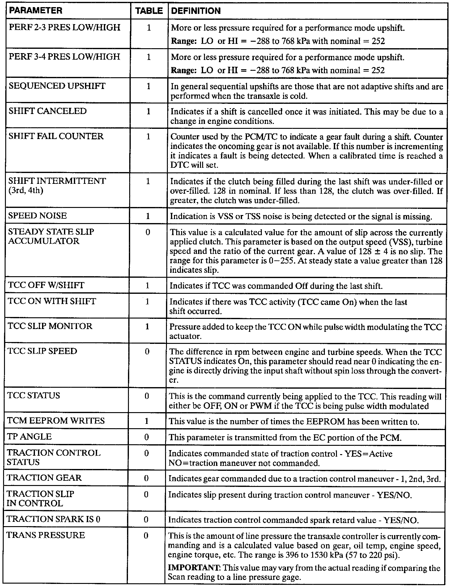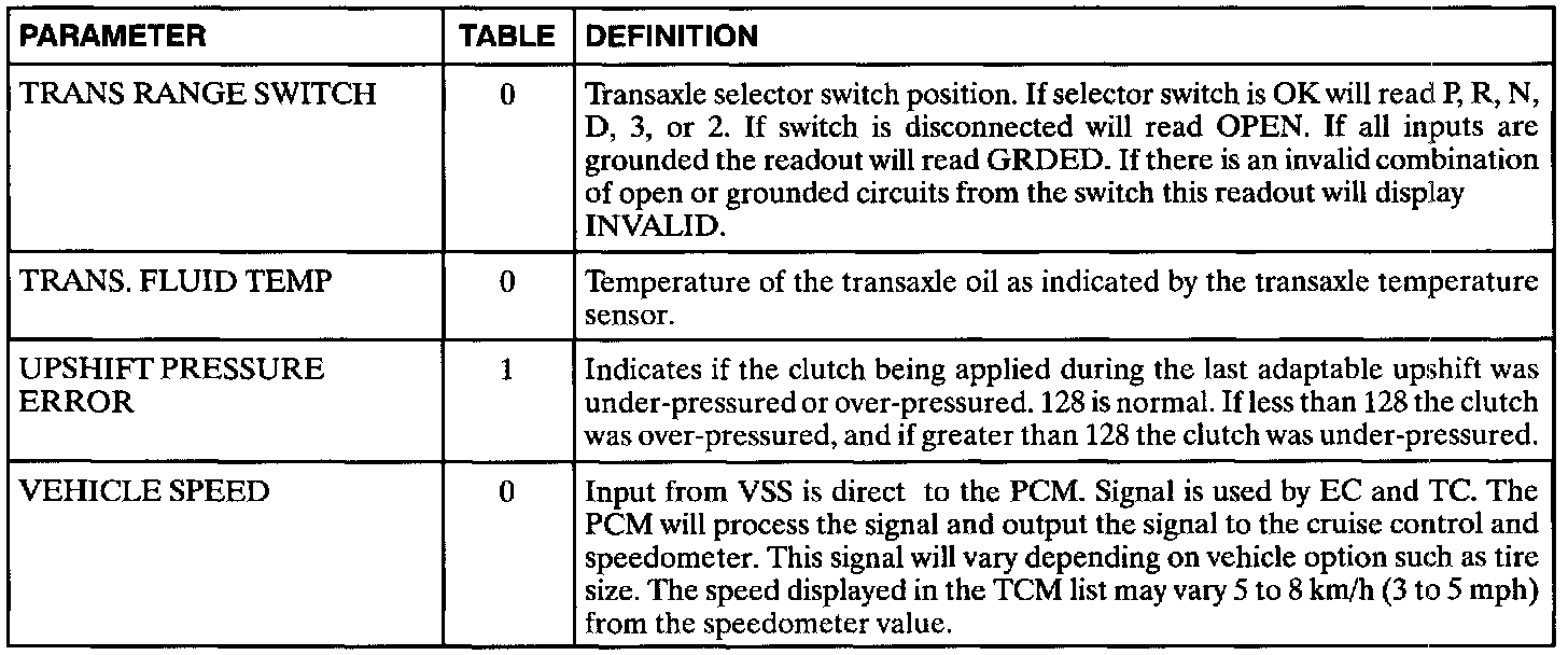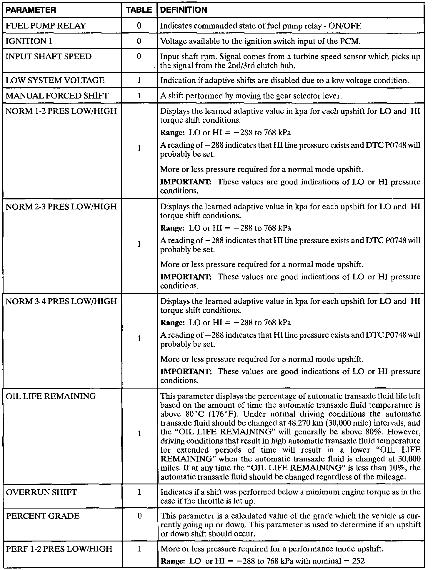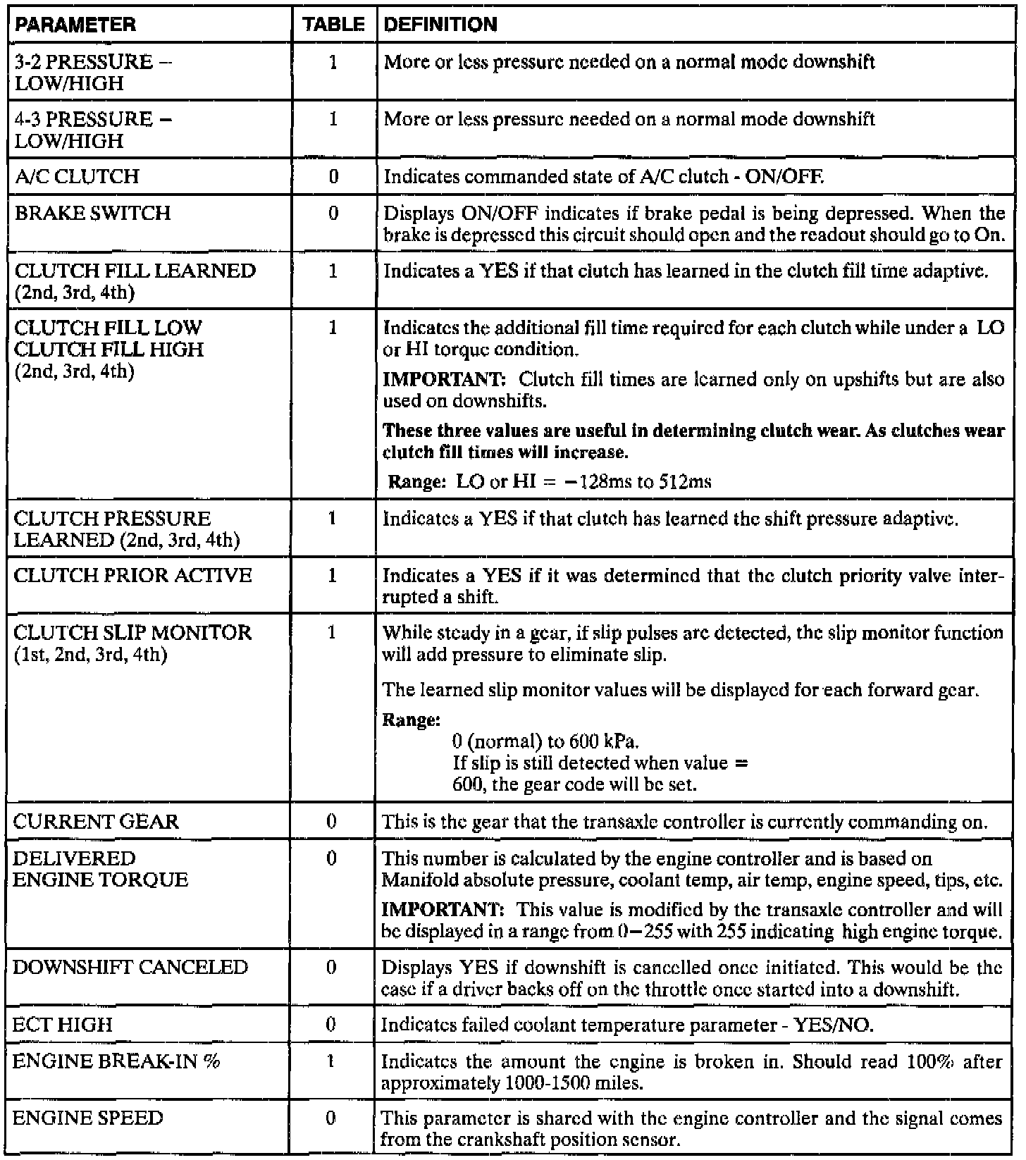 The following data definitions are intended to assist in understanding the data displayed by a Scan tool when it is communicating with the Powertrain Control Module. A thorough understanding of this data will not only aid in diagnosing transaxle related problems, but will also help eliminate unnecessary repairs.