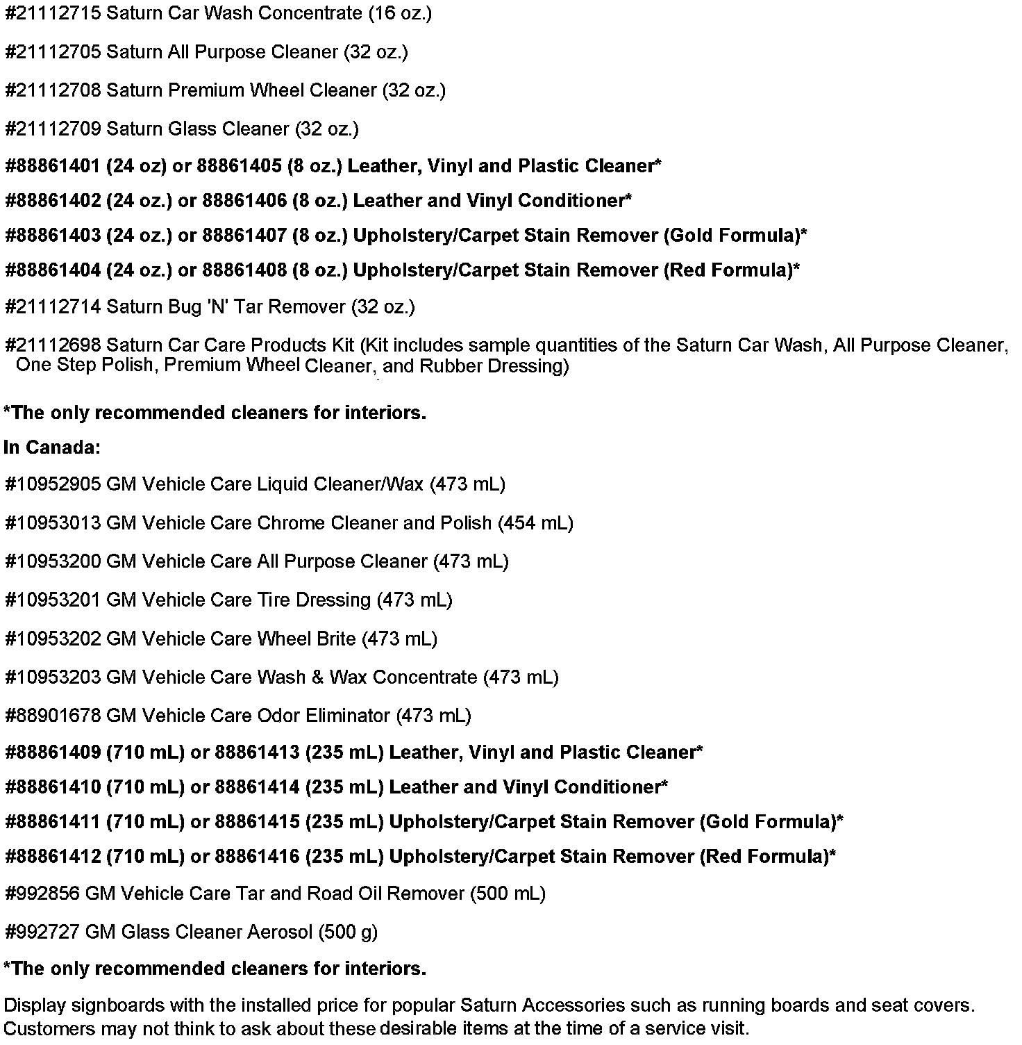 Encourage the use of Saturn Car Care Products to customers who clean and maintain the appearance of their vehicles themselves. Many customers may have never used Saturn Car Wash, Saturn One Step Polish or a longtime product, Saturn Glass Cleaner. Stock the shelves of the Service counter with these products and consider instituting compensation programs for Service Consultants who suggest these products. Many consumers faced with an intimidating wall full of car care products sold at local auto parts stores may find it comforting to purchase a fully-tested product sold by Saturn that they know will not harm the finish of their vehicle. We suggest that you recommend these competitively-priced basic vehicle care products.