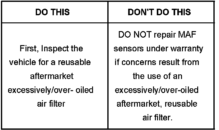 If an aftermarket reusable air filter is used, technicians should inspect the MAF sensor element and the air induction hose for contamination of oil prior to making warranty repairs.