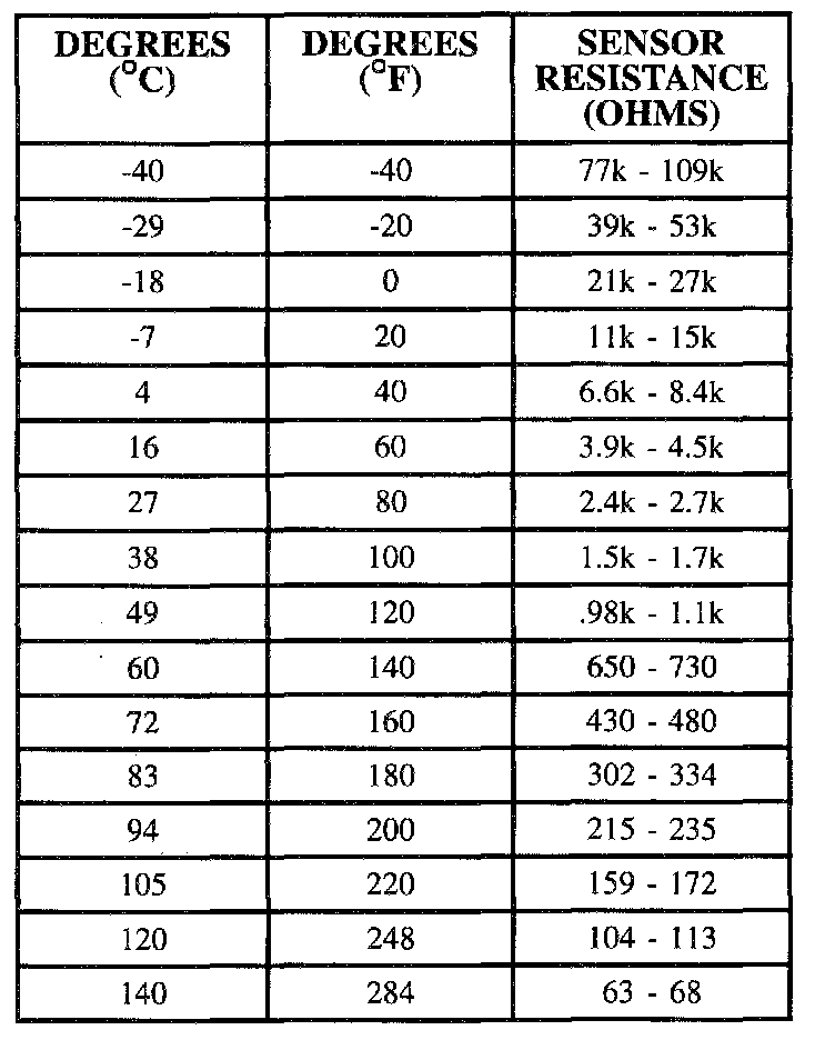 The ECT sensor is located in a coolant passage in the side of the cylinder head near the upper radiator hose. The ECT sensor is a two wire thermistor type sensor that varies resistance according to changes in engine coolant temperature. The PCM supplies a five volt reference through a resistor to the sensor, which is connected to ground. When the sensor is cold it has high resistance (high signal voltage at PCM). As the sensor temperature increases, its resistance decreases (lower signal voltage at PCM). The PCM uses the signal voltage to determine engine coolant temperature.