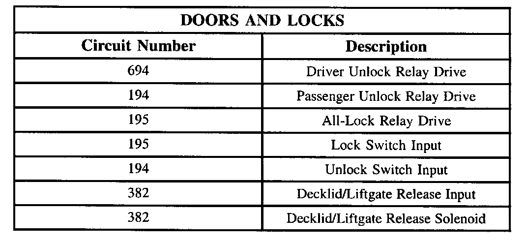 When an all-door unlock has been requested, the BCM switches circuit 194 to battery voltage. This energizes the door unlock relay which supplies power to the all-door lock motors. Grounding is achieved through the closed contacts of the door lock relay. Grounding is also achieved through the winding of the driver door lock motor and the driver door unlock relay.