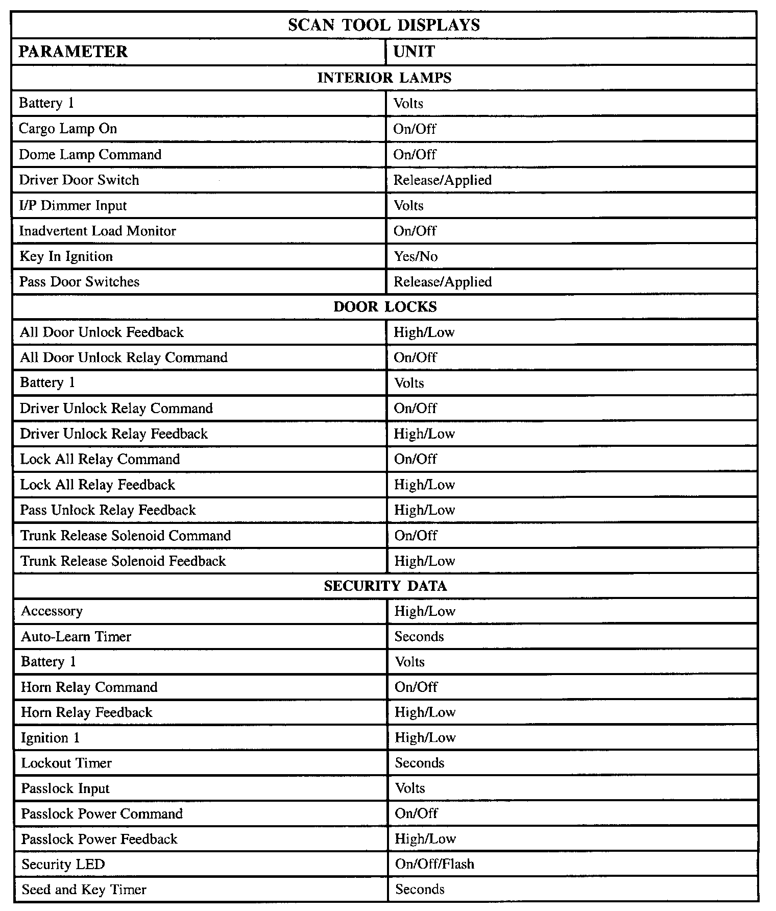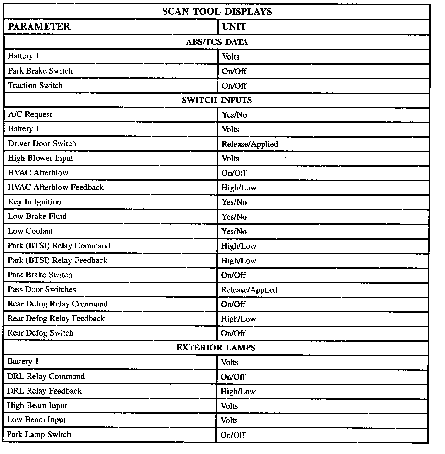 The table lists the parameters displayed by the Scan tool. The parameters are displayed by ABS/TCS data, switch inputs, exterior lamps, interior lamps, door locks, and security data groups.