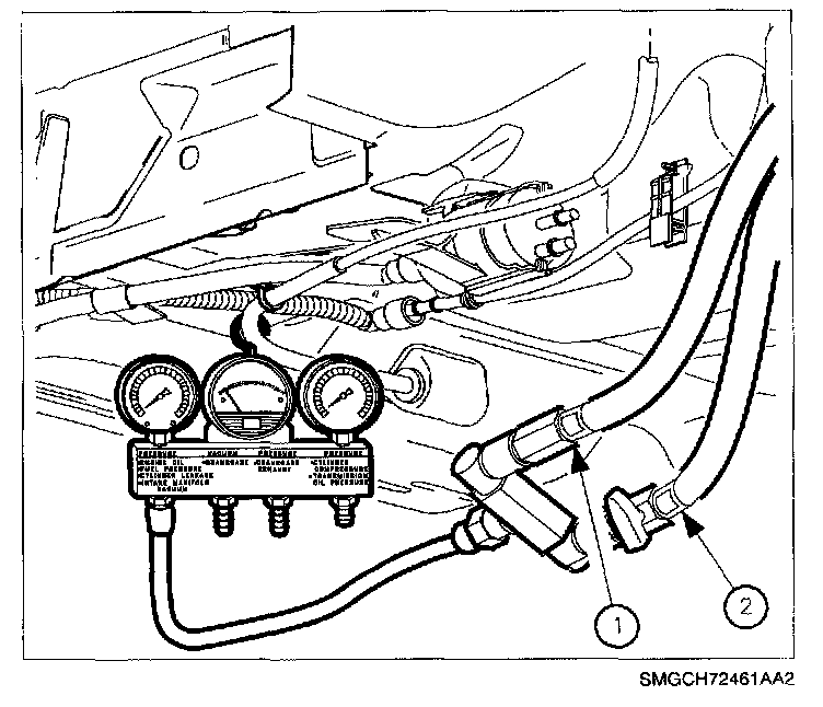 5. Connect Fuel Flow/Pressure Test Adapter SA9127E-7 to (1) feed and (2) return lines and make sure connections are firmly latched.