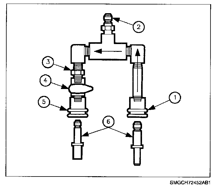 It is connected with the inlet side (1) to the fuel feed (either at the fuel rail or at the filter/pressure regulator inlet), the outlet (5) to fuel return (or drain), and the gauge port (2) to the pressure gauge. The ON/OFF control valve (4) provides a means to control fuel flow for pressure and leakdown testing.