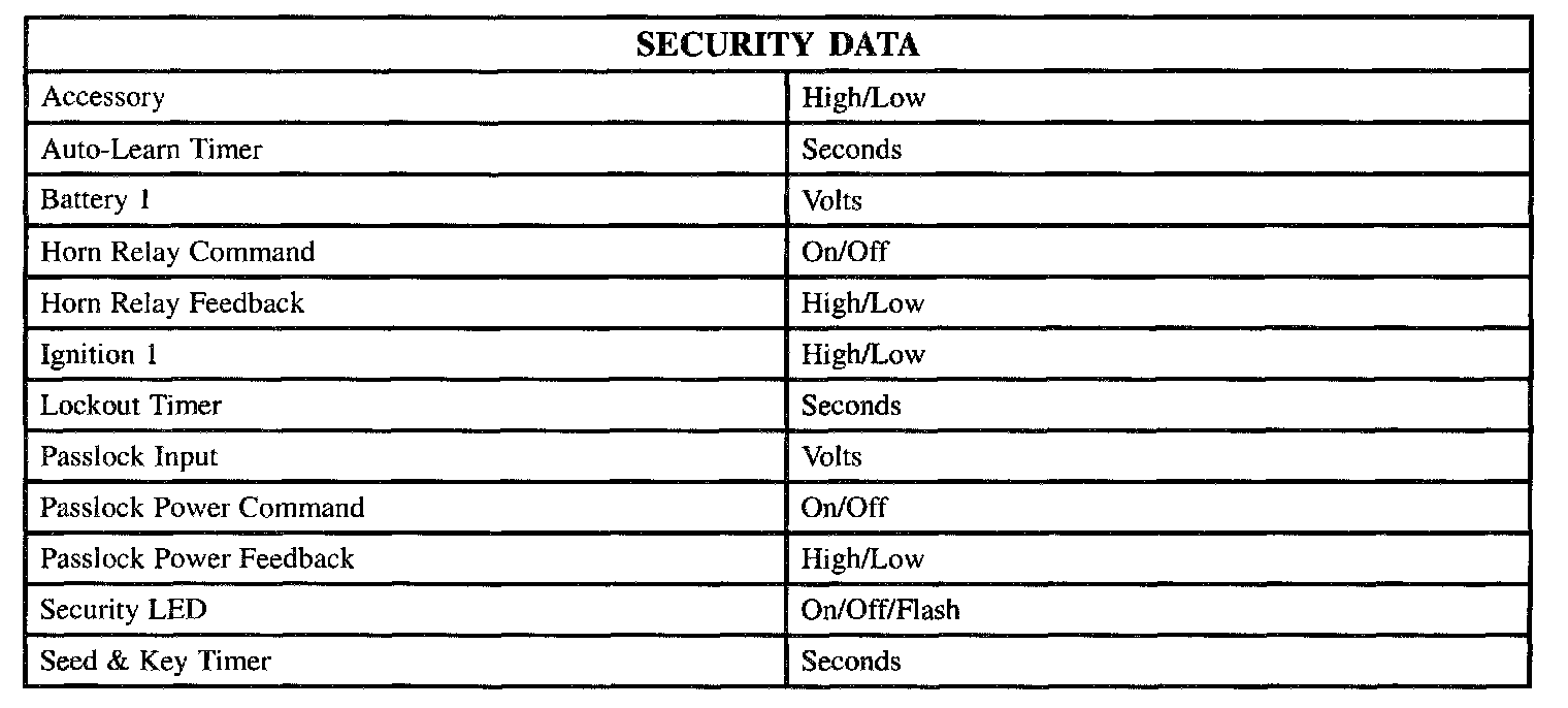 The table lists the security data directly connected to the Body Control Module (BCM) related to the Passlock System only: