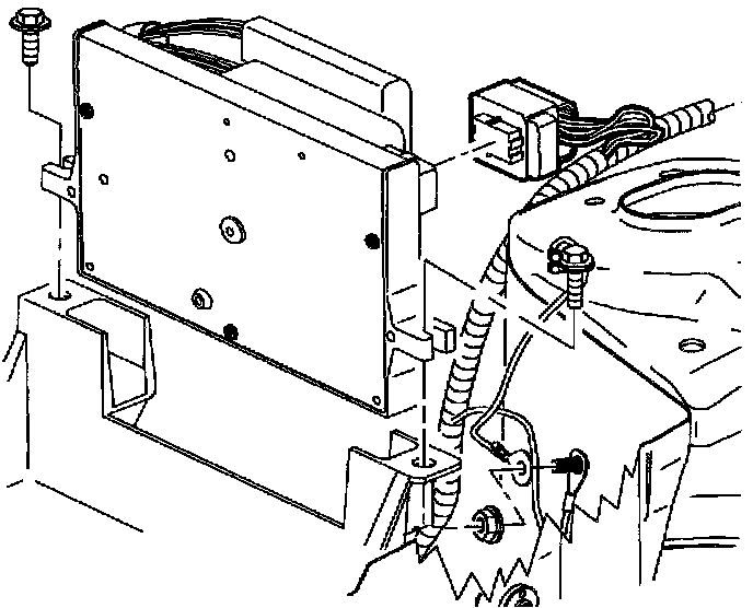 1. Position ABS control assembly on mid-rail bracket by sliding towards rear of vehicle. Slide rearward to align bracket tab into bracket slot, then install and torque mid-rail bolt.