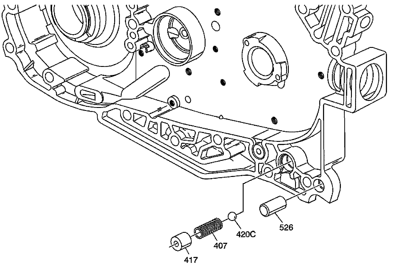 The converter drain back check ball (420C) has been removed from the cooler line fitting and is now located in the channel plate.