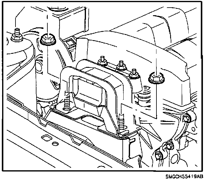 2. Place a floor jack under engine oil pan (use a block of wood between oil pan and jack). Raise powertrain just enough to unload engine mount assembly. (Engine is raised enough when there is clearance between engine mount assembly and midrail bracket.)