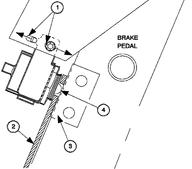 12. Install Stop Lamp Switch Adjustment Gage SA9303BR (2) between the switch and the switch actuator pad (3) on the brake pedal arm being sure that the plunger (4) protrudes through the slot in the gage.