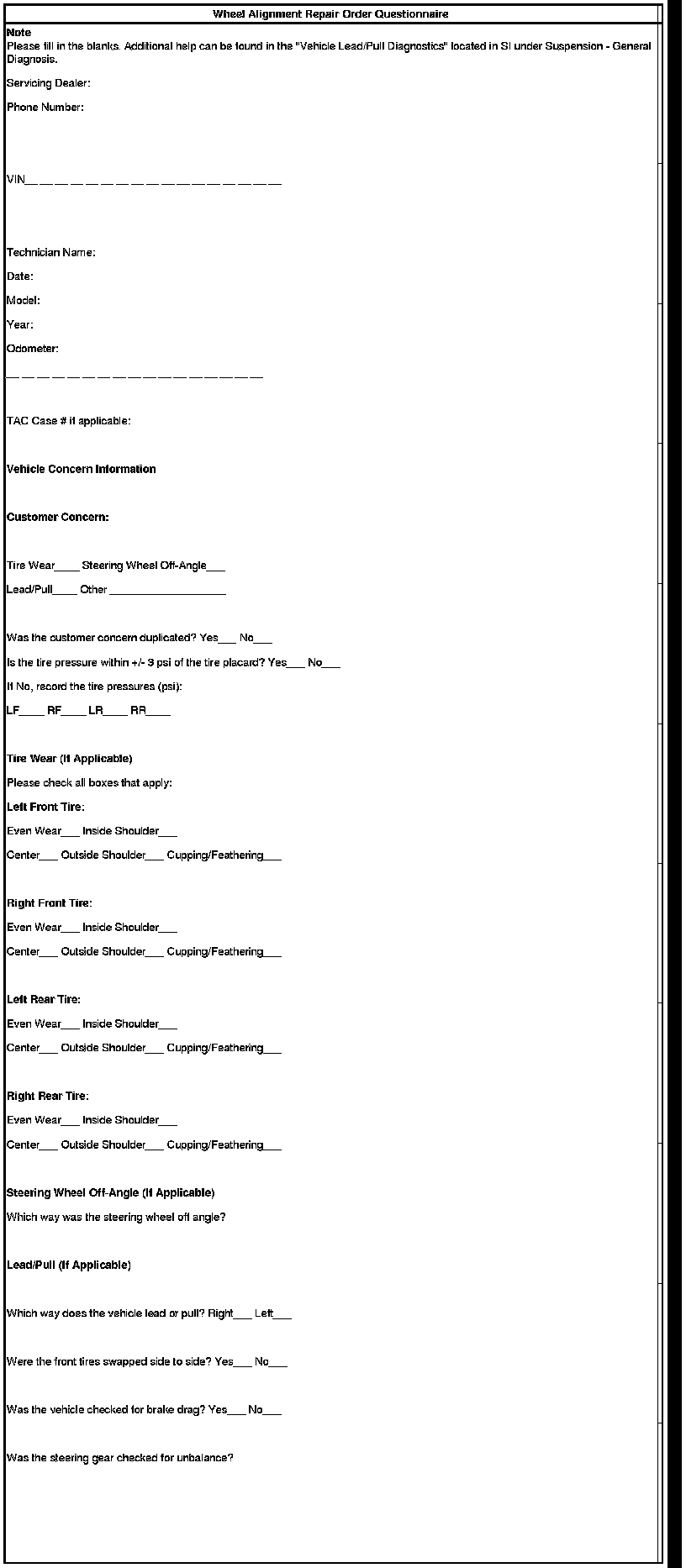 4. Attach the Wheel Alignment Repair Order Questionnaire below along with the print-out of "Before" and "After" wheel alignment measurements to the Repair Order and retain for use by GM.