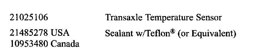 1. Apply sealant with Teflon(R) P/N 21485278 (or equivalent) to threads before installing on transaxle.
