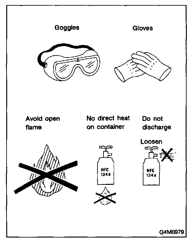 Do not put CFC-12 refrigerant into a HFC-134a air conditioning system. Also, do not put HFC-134a refrigerant into a CFC-12 air conditioning system. If the wrong refrigerant is used, poor lubrication will result and the compressor itself may be destroyed.
