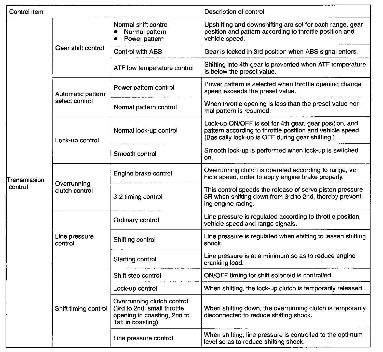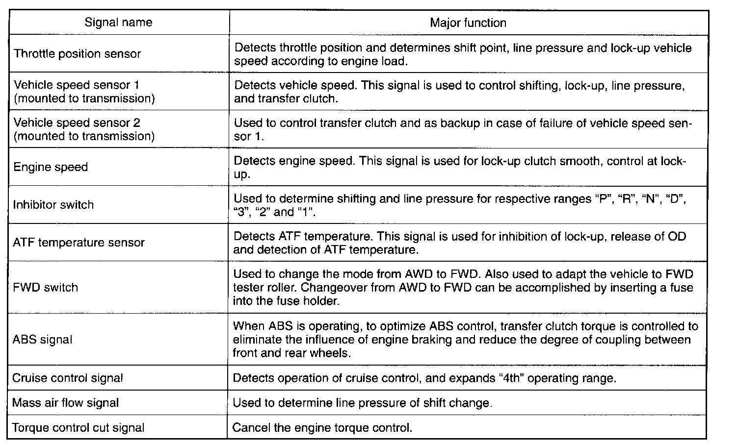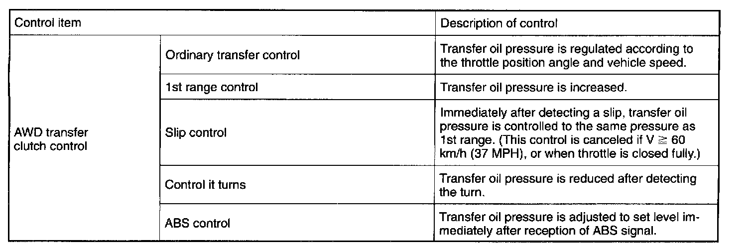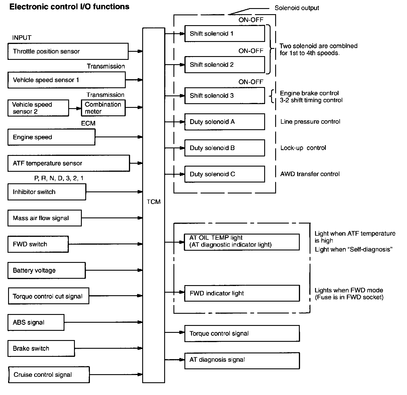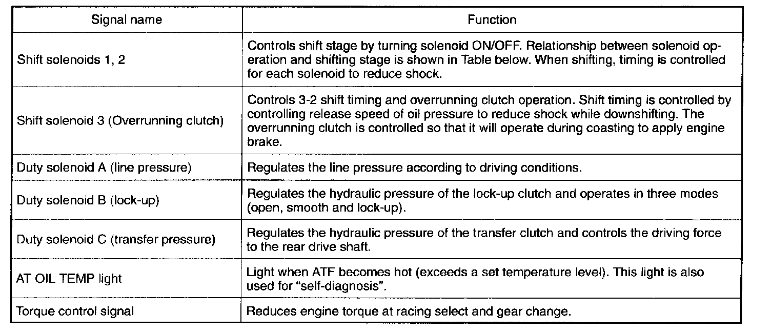 The electronic-hydraulic control system consists of various sensors and switches, a Transmission Control Module (TCM) and the hydraulic controller including solenoid valves. The system controls the transmission proper including shift control, lock-up control, overrunning clutch control, line pressure control, auto pattern select control and shift timing control. It also controls the AWD transfer clutch. In other words, the system detects various operating conditions from various input signals and sends output signals to shift solenoids 1, 2 and 3 and duty solenoids A, B and C (a total of six solenoids).