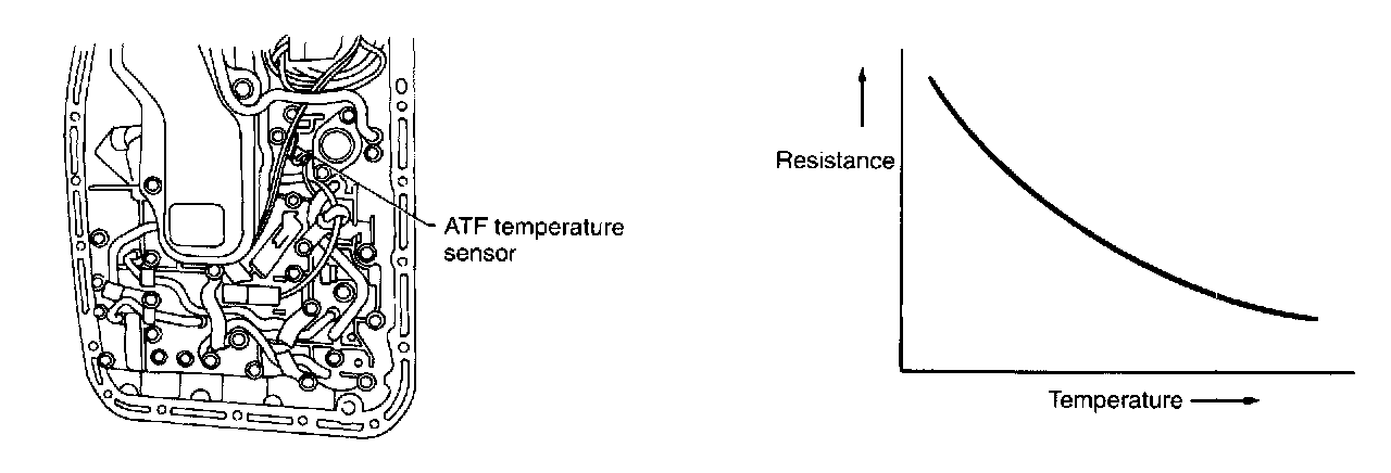 This sensor is mounted to the control valve in the transmission. It detects temperature change as an analog electrical signal. The output characteristics of the sensor are shown below.