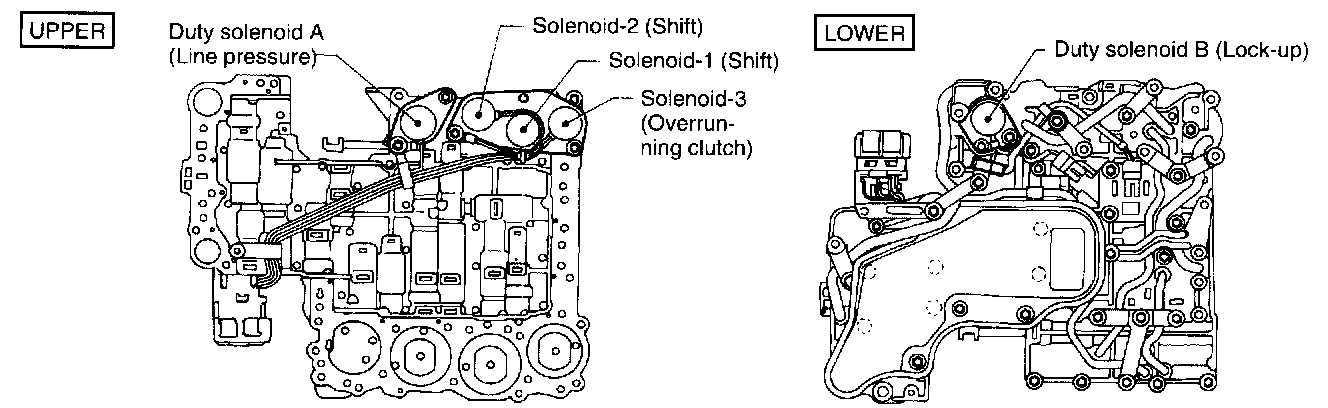 These solenoids are mounted to the control valve. They are turned ON or OFF according to signals sent from the TCM. The gear positions are changed according to the ON and OFF condition of these solenoids.
