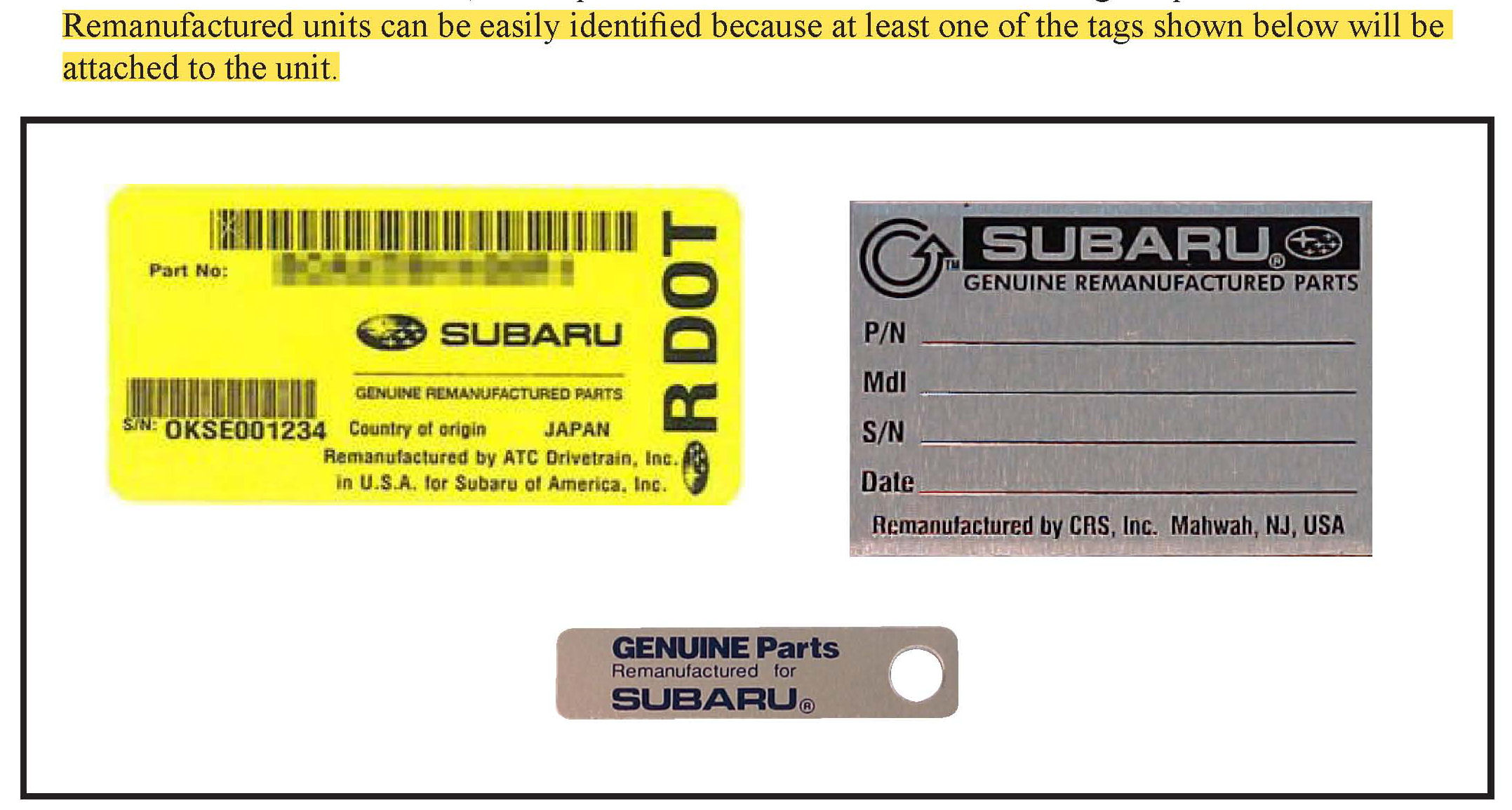 Remanufactured transmissions may not be used to repair new in-stock vehicles. To ensure full core credit, dealers should follow all instructions listed on the Subaru Transmission Core Return Procedures and fill out the documentation completely using the online core return system. Keep a copy of the Credit Request and Diagnosis Form with the vehicle records. All transmissions replaced with a remanufactured transmission (warranty or non-warranty) are returned to SUBARU OF AMERICA, Inc. at the Grove City, OH address outlined in the document package. All other OE transmissions replaced under warranty must be shipped to the location indicated on the warranty parts return notice. Transmissions incorrectly shipped will result in the dealer not receiving the core credit or a debit of the claim for a part not returned as requested. The dealer will be responsible for tracing and returning the unit to the correct location at their own expense.