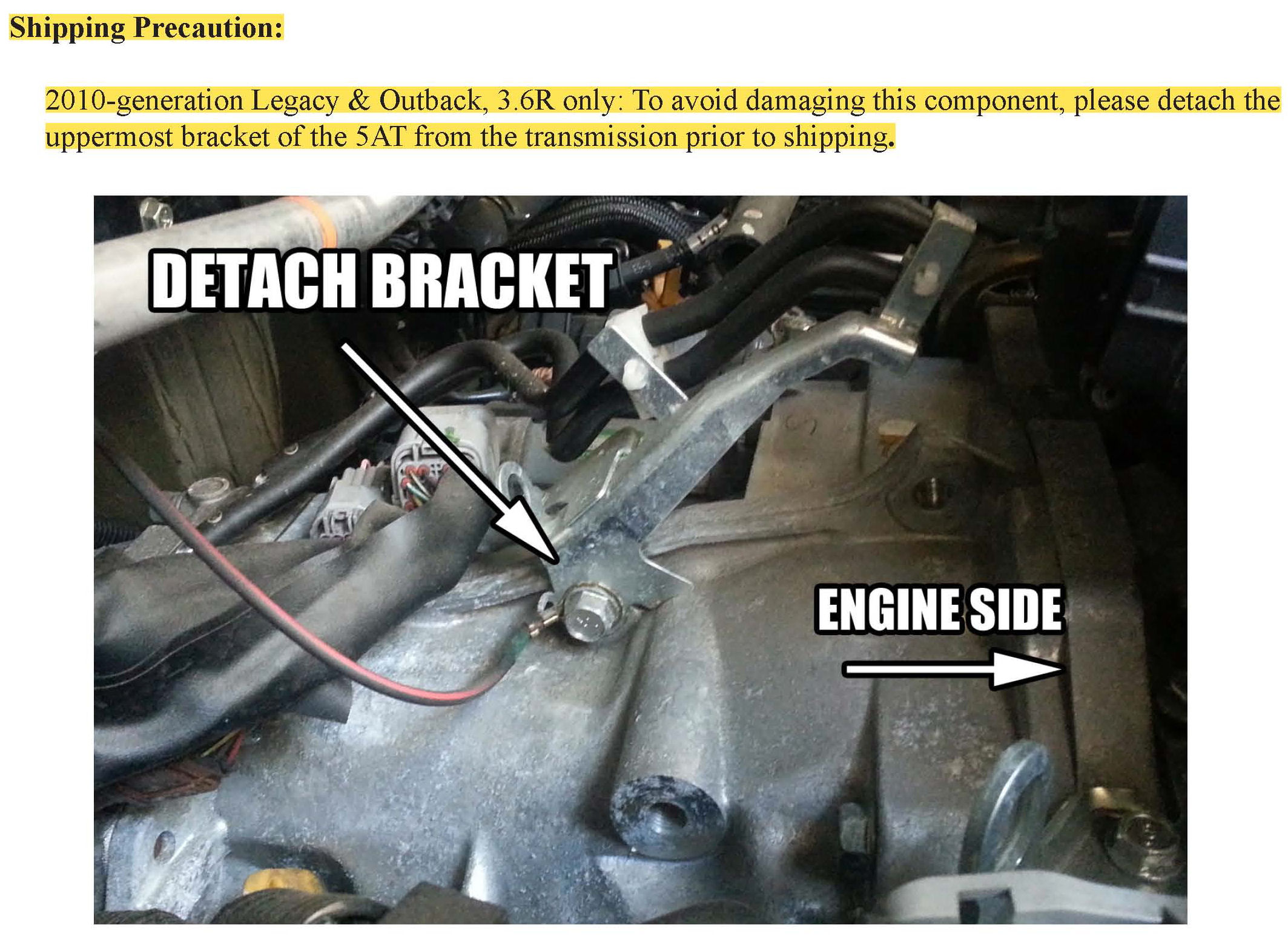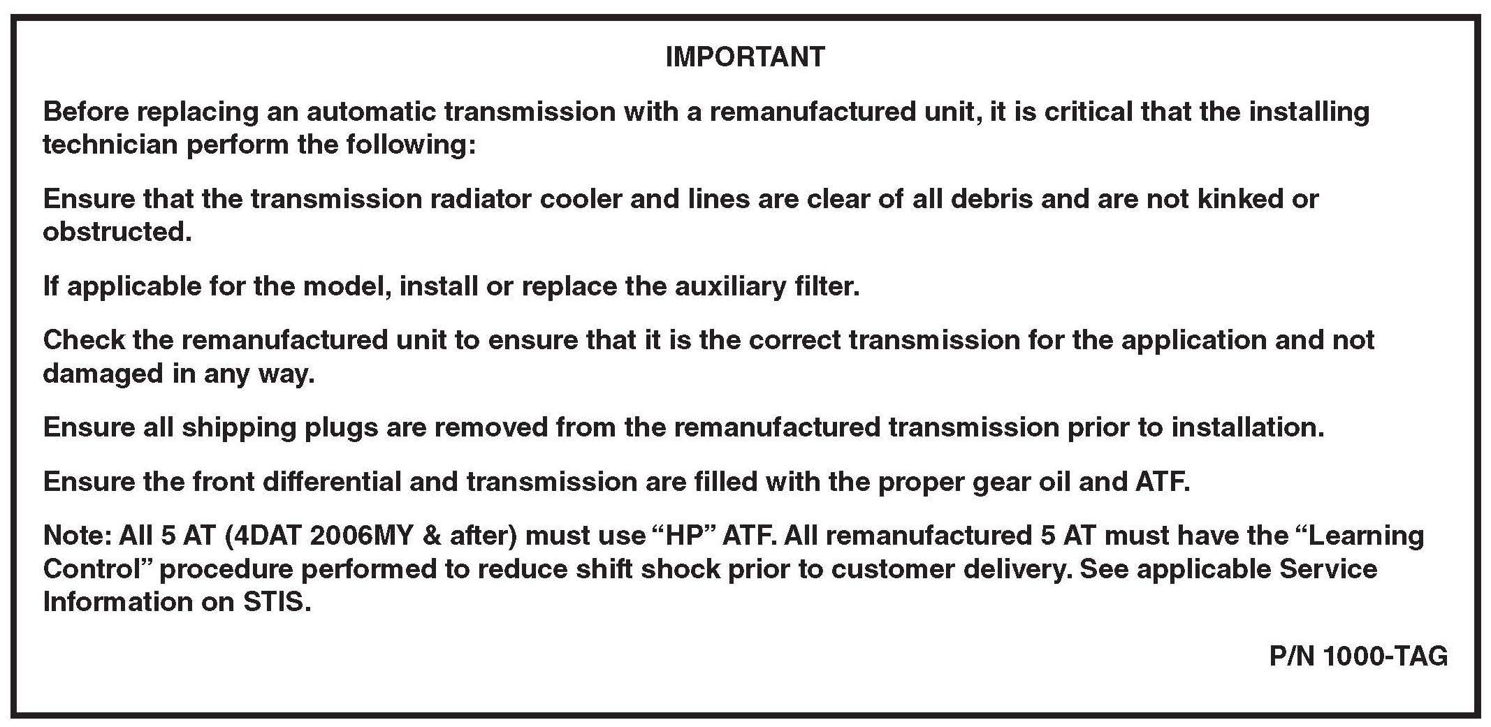 Each remanufactured transmission will have a tag attached explaining the installation procedures and precautions. These procedures must be followed otherwise non-warranty failures could occur. The cooler flushing procedure can be found in Subaru Service Bulletin 16-42-90.
