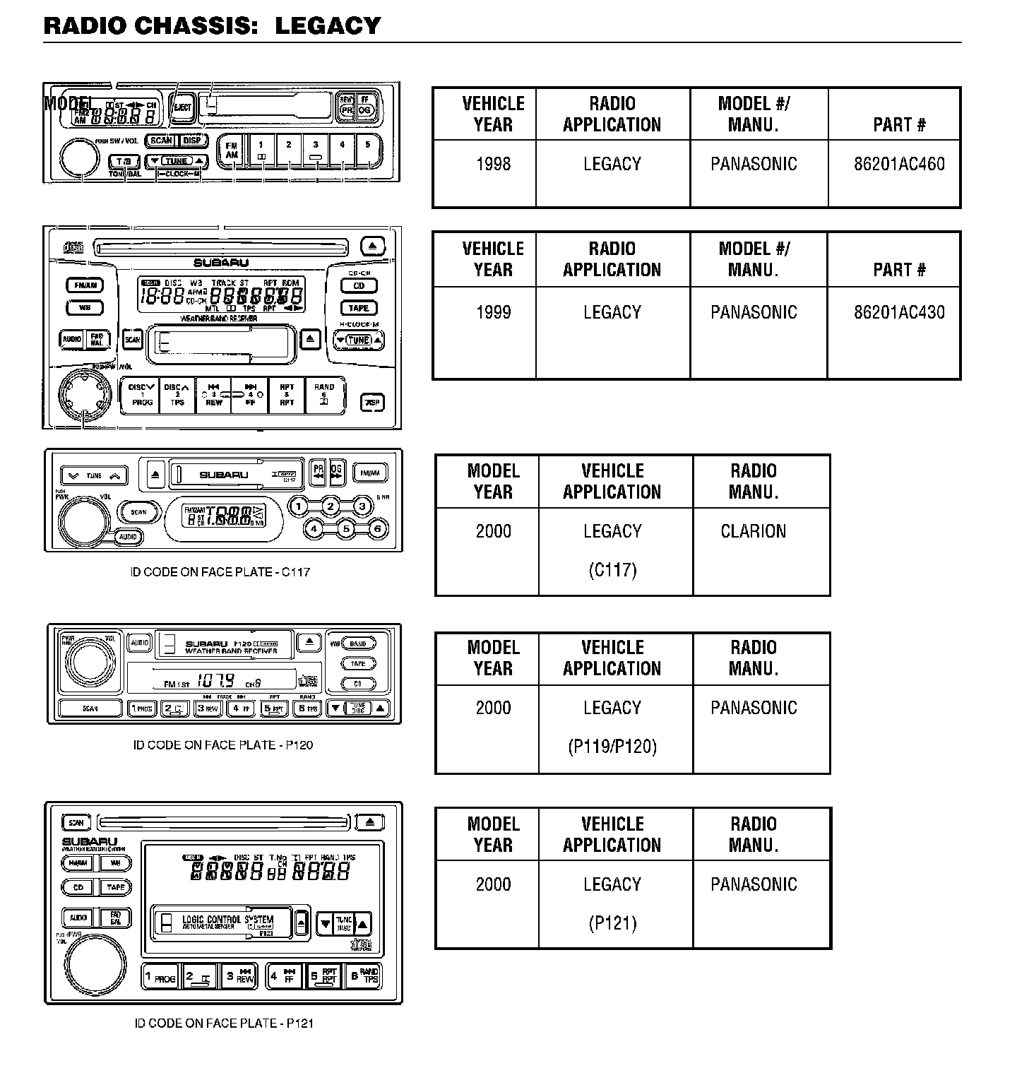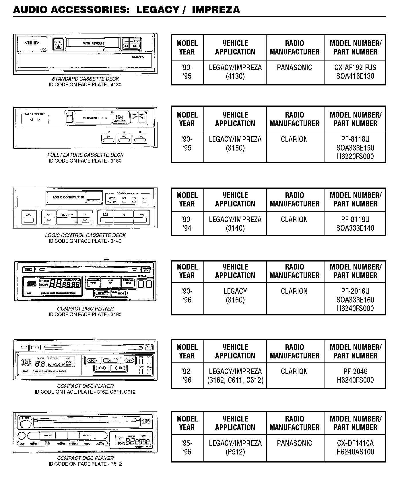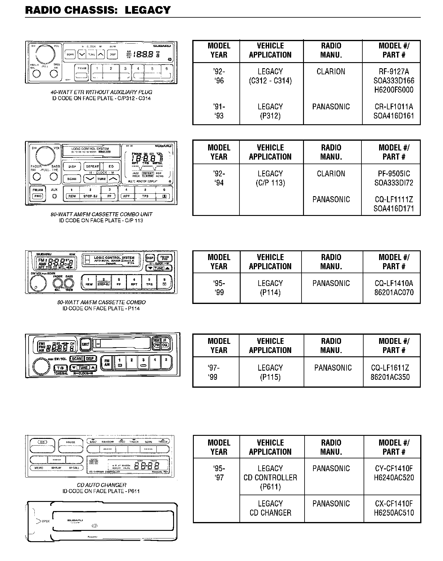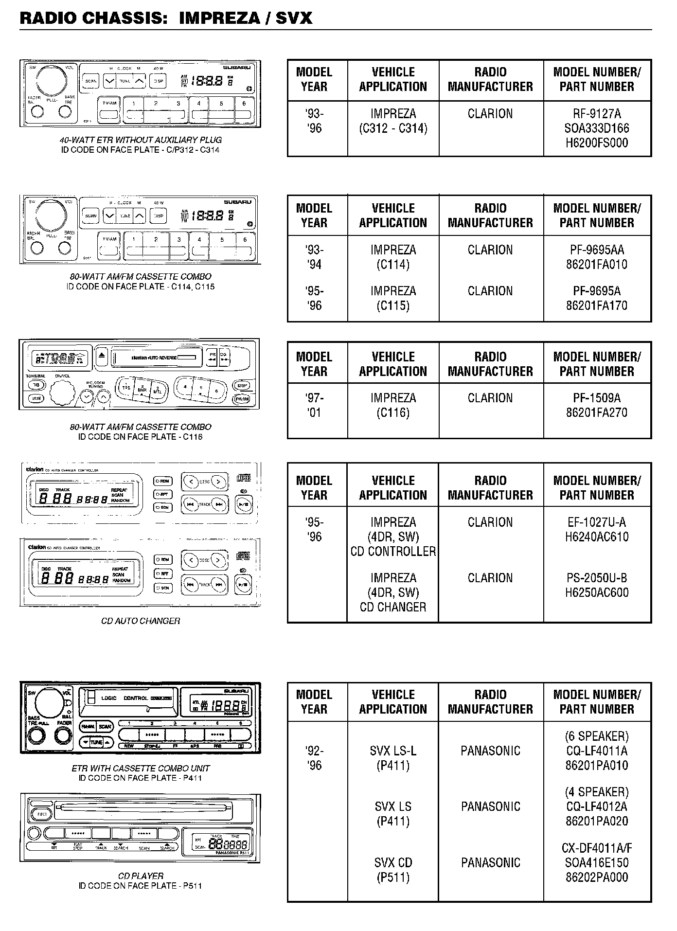This bulletin contains illustrations of Genuine Subaru Audio System face plates for model years 1993 through 2001.