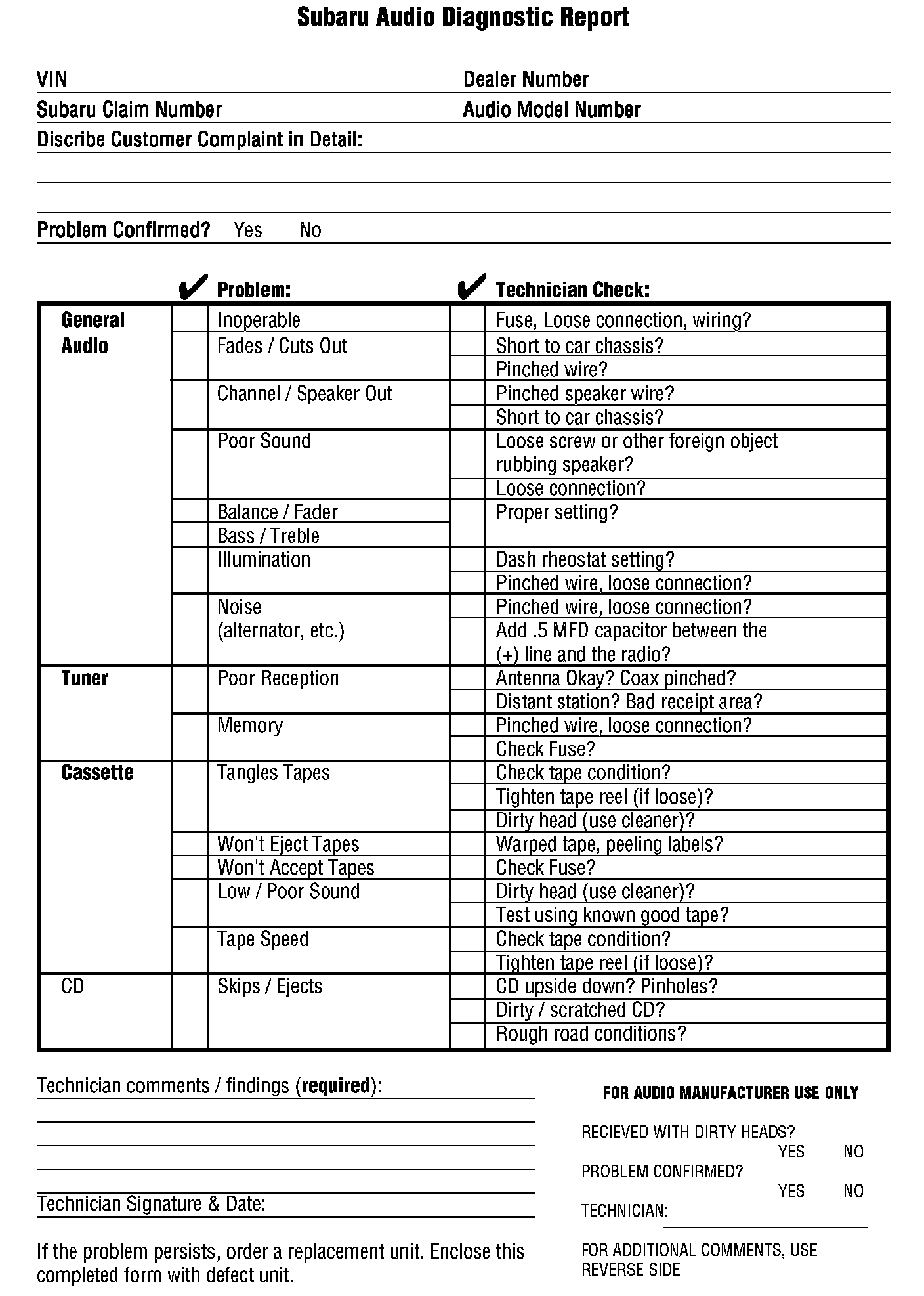 A copy of the Subaru Audio Diagnostic Report should be completed and retained by the dealer for all audio system related warranty claims, Whether the audio unit is exchanged or not. If the audio chassis is exchanged, a completed report copy should be included with the return unit. If the audio chassis is not exchanged and a repair is made to the audio system, a completed report copy must be kept with the warranty claim.