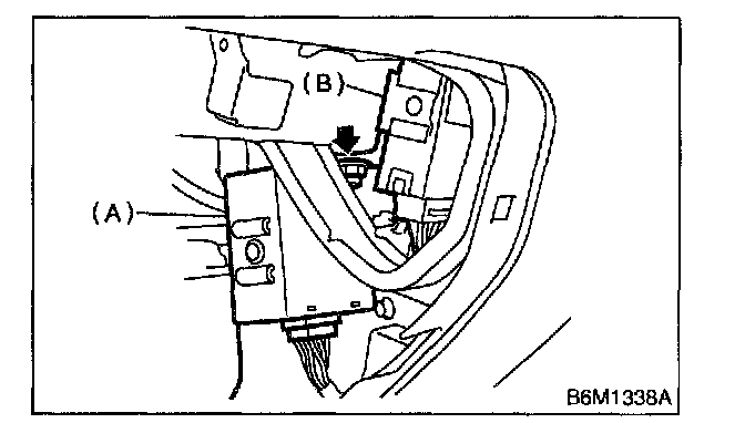 3. Remove nut, then remove keyless entry control module (B) and the other electrical control module (A) while disconnecting connector.