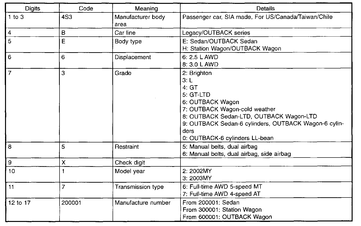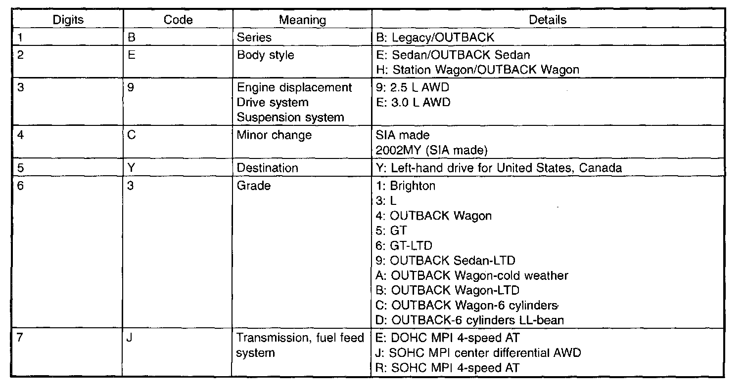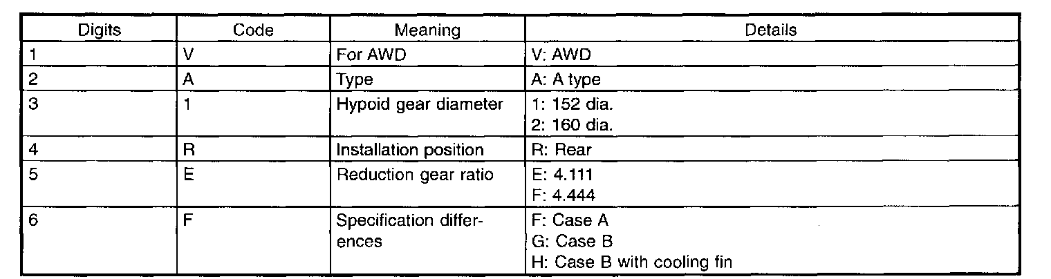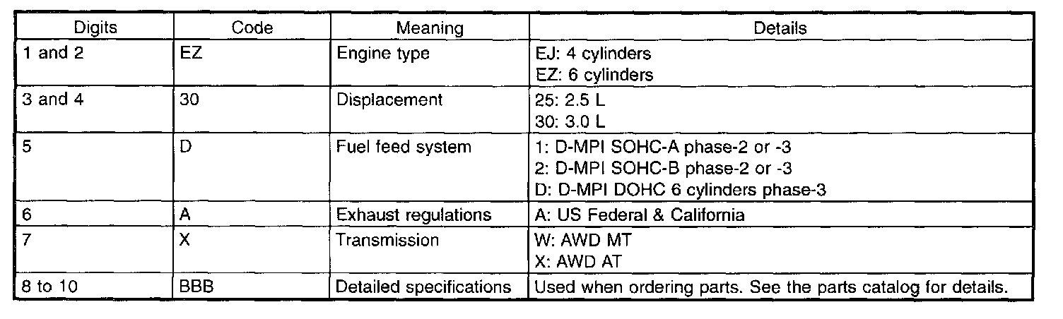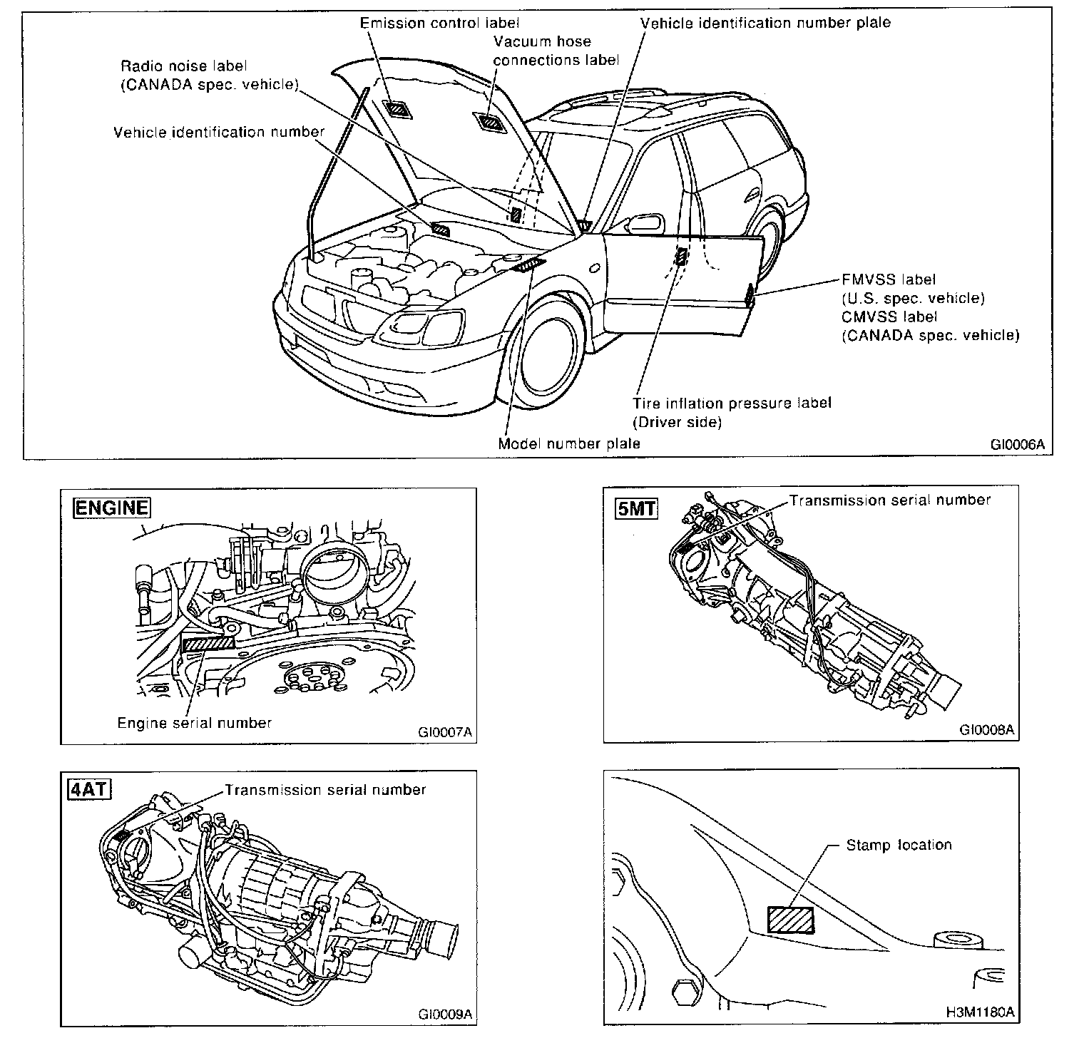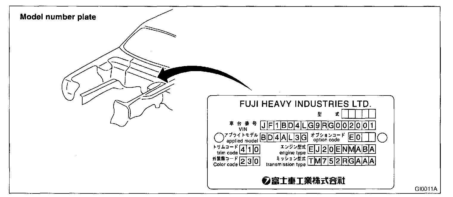 The model number plate indicates: the applied model, the option code, the trim code, the engine type, the transmission type, and the exterior color code. This information is helpful when placing orders for parts.