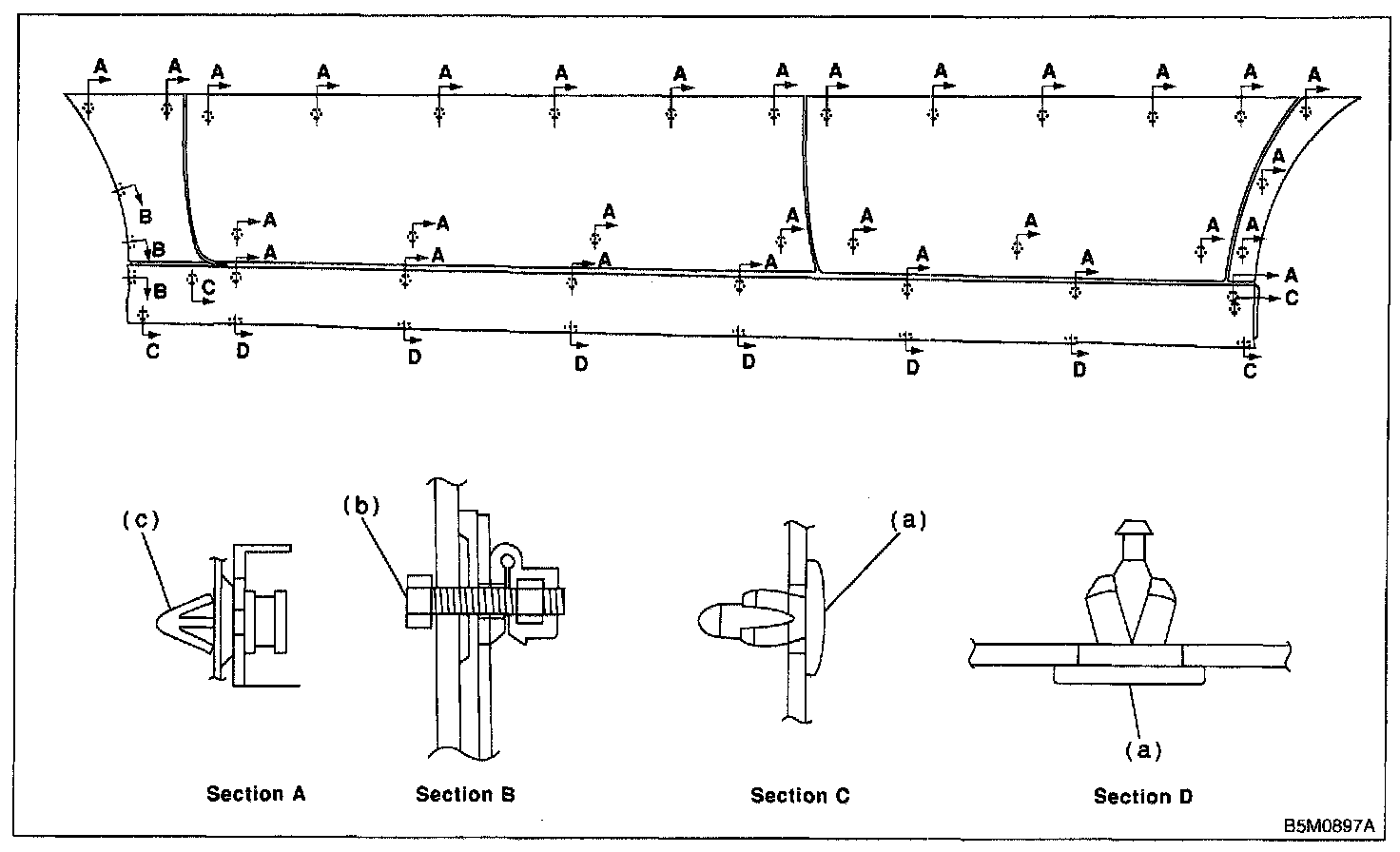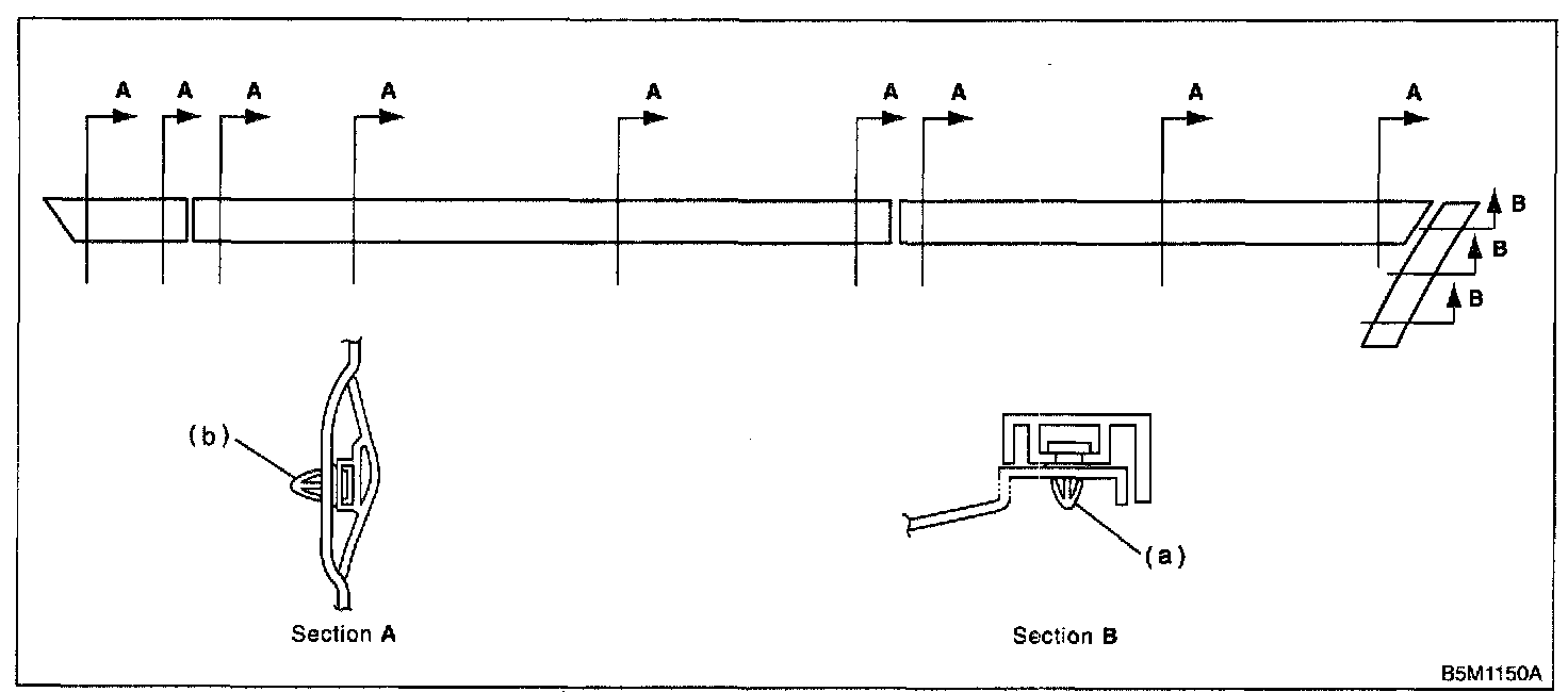 3. Insert fishing line [0.8 mm (0.31 in) dia.] between side protector and vehicle body. Cut (pull the line) through two-sided tape along side protector on the body. Using a puller, remove clips from vehicle body while pulling side protector towards yourself as required.