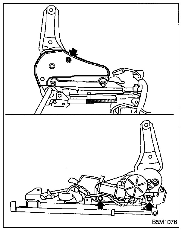 24. Remove the cover on the underside of the seat hinge, remove the two bolts, and remove the seat hinge.