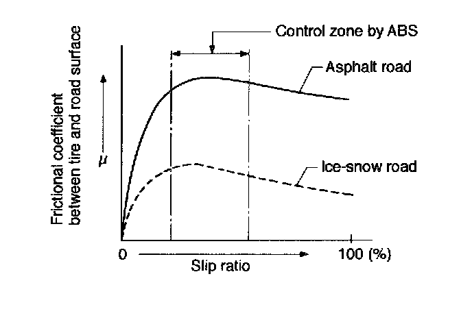The braking effectiveness is represented by the "coefficient of friction" between the tire and road surface. The larger the coefficient, the higher the braking effectiveness. The diagram below shows the relationship between the coefficient of friction and the slip ratio for two different road surface conditions (asphalt-paved road and icy road), assuming that the same tires are used for both the conditions and the vehicles are moving forward. Although the braking effectiveness (coefficient of friction) depends on the road surface condition as shown and also on the type of the tire, its peak range generally corresponds to the 8 - 30% range of the slip ratio.