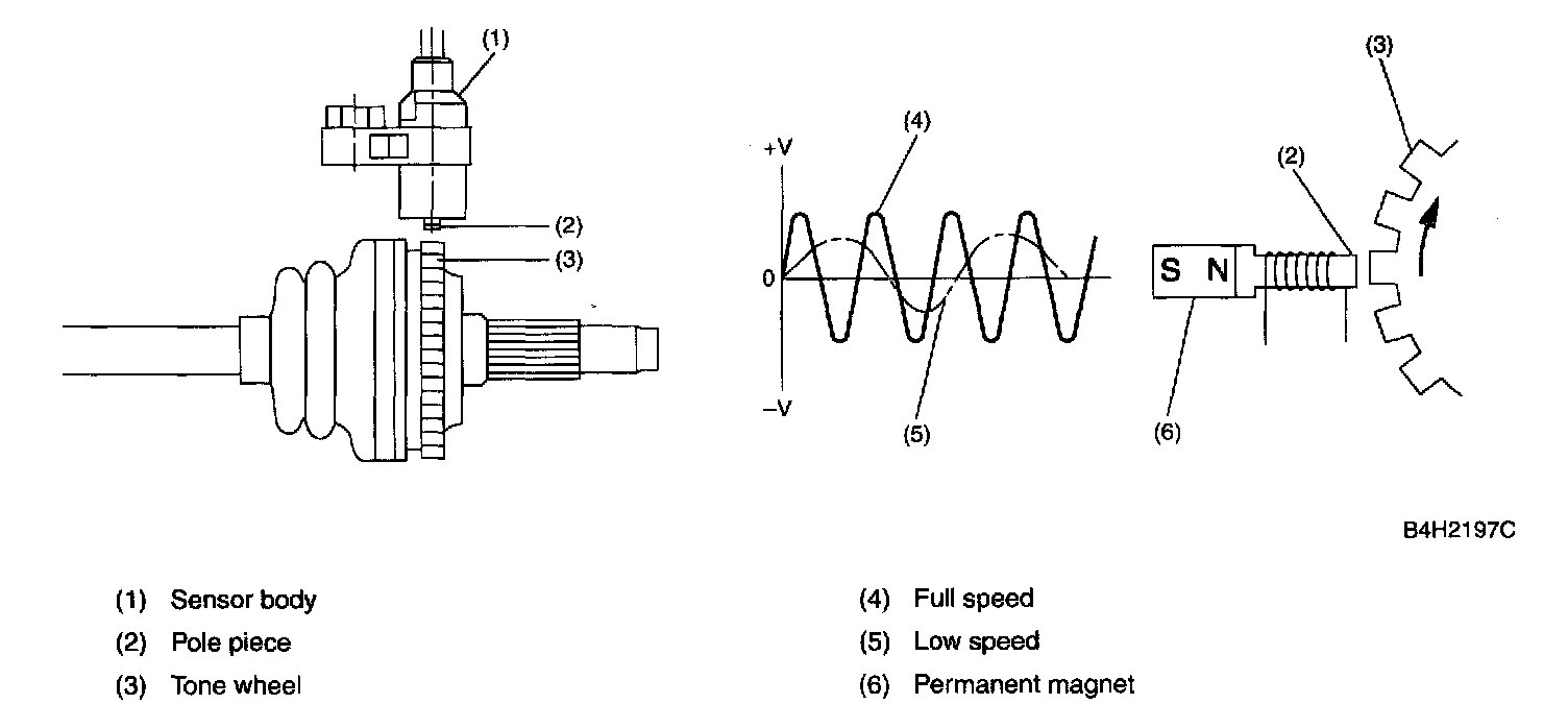 Each of the ABS sensors detects the speed of the corresponding wheel. The sensor consists of a permanent magnet, coil and tone wheel. The magnetic flux produced by the permanent magnet changes as each tooth of the tone wheel (which rotates together with the wheel) passes in front of the magnet's pole piece. The changing magnetic flux induces voltages at a frequency corresponding to the wheel speed.