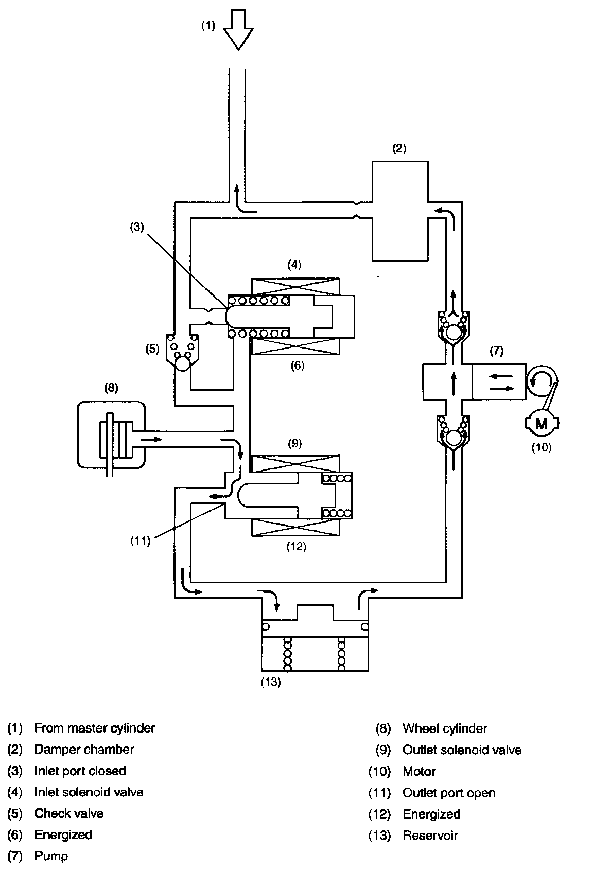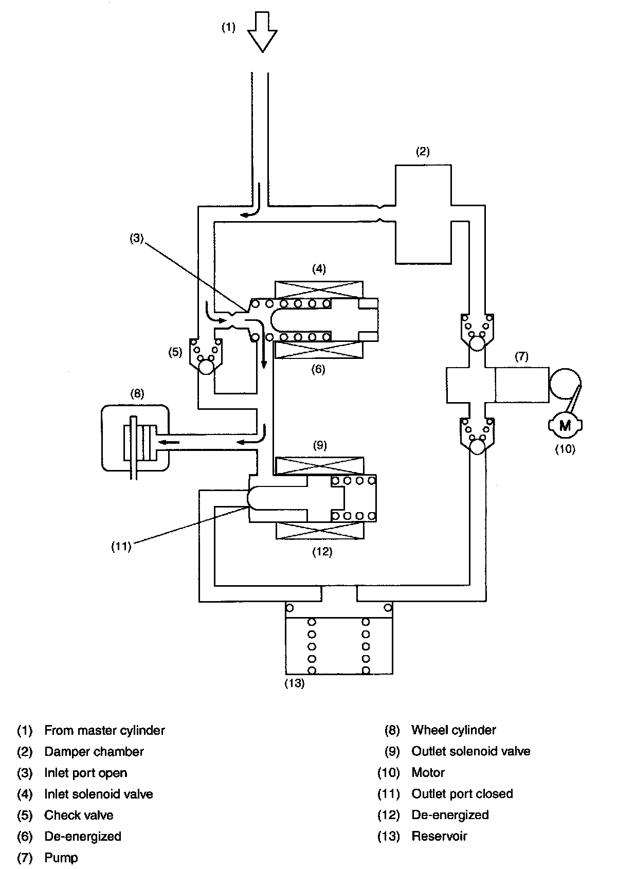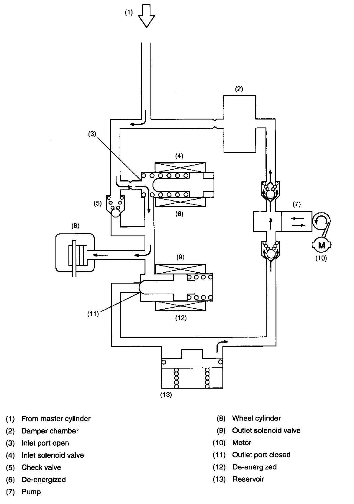 Both the inlet and outlet solenoid valves are not energized. This means that the inlet port of the inlet solenoid valve is open, whereas the outlet port of the outlet solenoid valve is closed. So the fluid pressure generated in the master cylinder is transmitted to the wheel cylinder, producing a brake force.