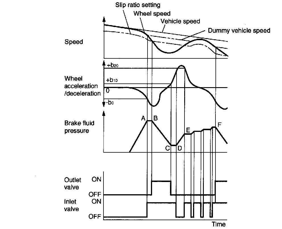Depressing the brake pedal increases the brake fluid pressure in each wheel cylinder, which in turn decreases the wheel speed (or increases the wheel deceleration rate). When the brake fluid pressure is increased to a level of point "A" of the brake fluid pressure curve in the diagram below (at which the wheel deceleration rate exceeds threshold "-b0"), the ABSCM makes a pressure "hold" control. At the same time, the ABSCM calculates a "dummy" vehicle speed which is a reference speed it uses in the next stage of control.
