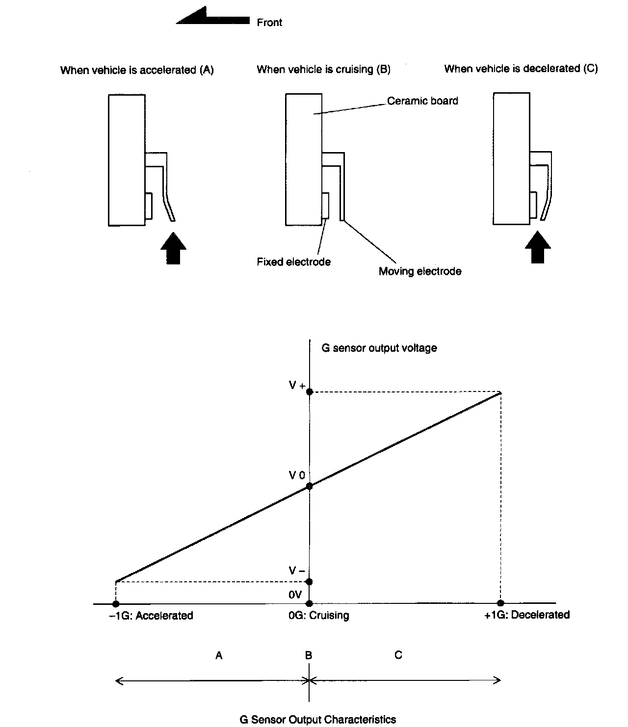 The G sensor detects changes in the vehicle's acceleration/deceleration rate in the longitudinal direction. The moving electrode of a capacitor in the sensor moves away from or close to the fixed electrode as the vehicle accelerates or decelerates and the resulting change in the capacitance of the capacitor is outputs to the ABSCM as a change in the voltage.