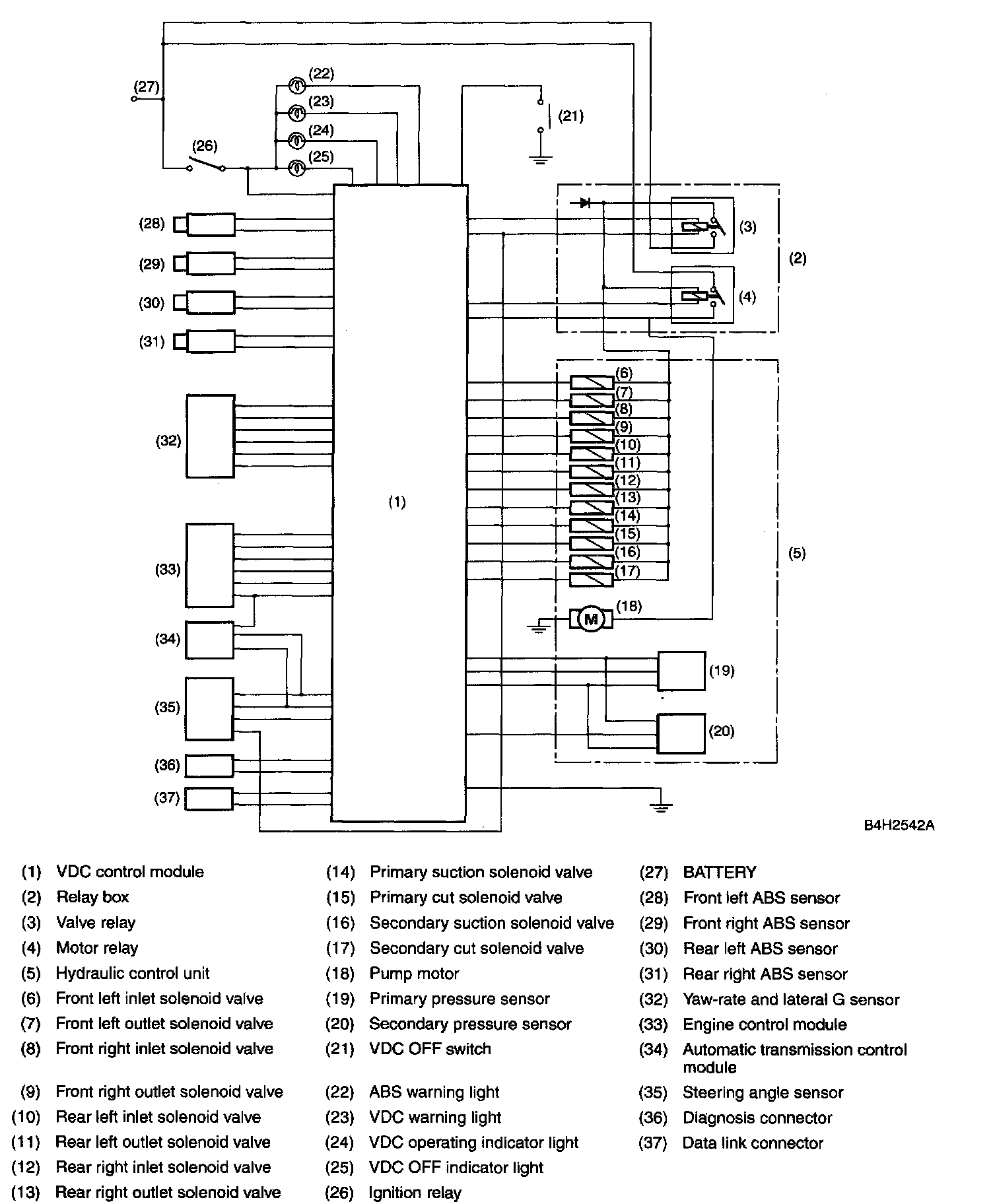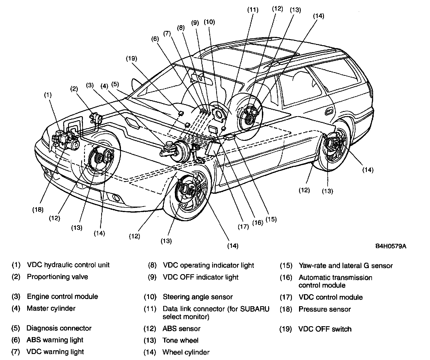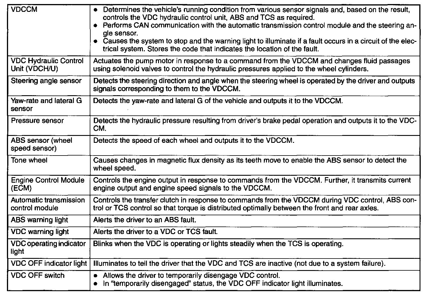 The vehicle dynamics control (VDC) system is a driver assist system which enhances vehicle's running stability by utilizing the anti-lock brake system (ABS) and traction control system (TCS) functions in combination with its own function which reduces sudden changes in vehicle behavior that are likely to occur when travelling on a slippery road or quickly avoiding an obstacle on the road.