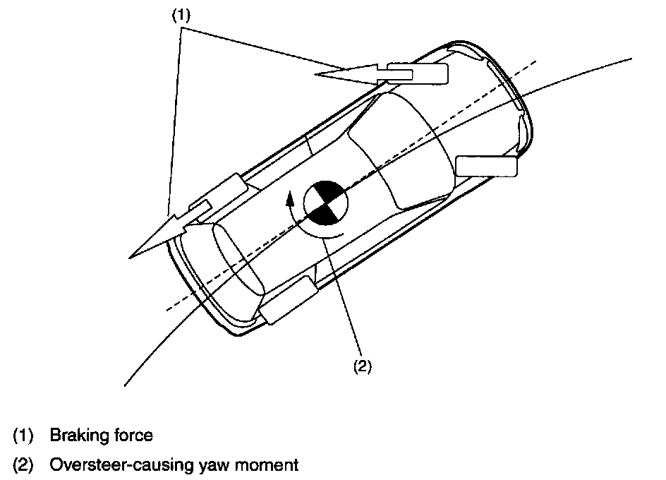 When the vehicle starts to spin during cornering, the VDC control module (VDCCM) actuates the brakes on the front and rear outer wheels. As a result, a force that counteracts the oversteer-causing yaw moment is generated so that the vehicle's behavior is stabilized.