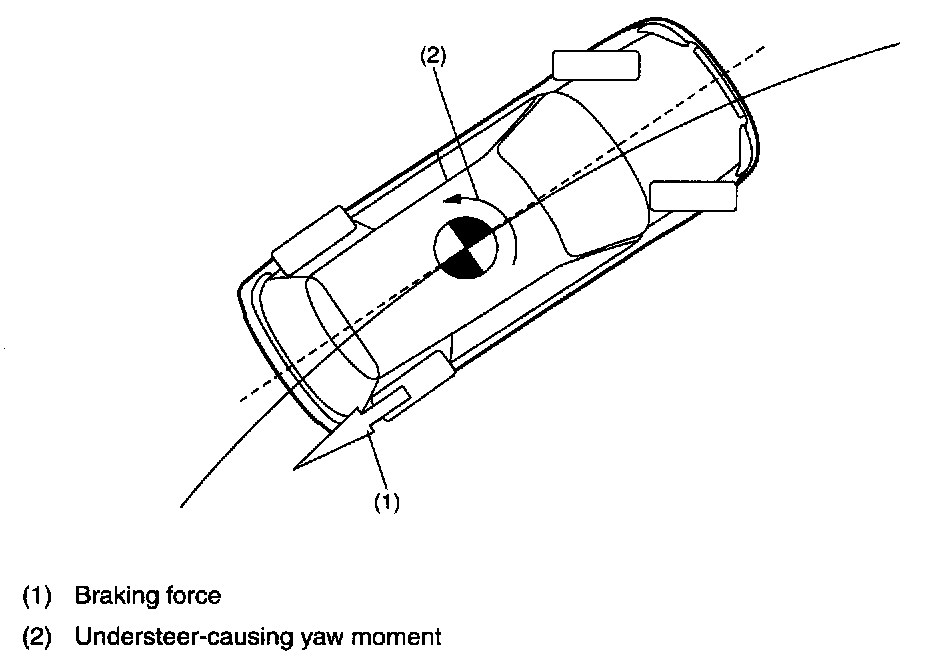 When the vehicle starts to drift outward during cornering, the VDCCM causes the rear inner wheel to be braked. As a result, a force that counteracts the understeer-causing yaw moment is generated so that the vehicle's behavior is stabilized.