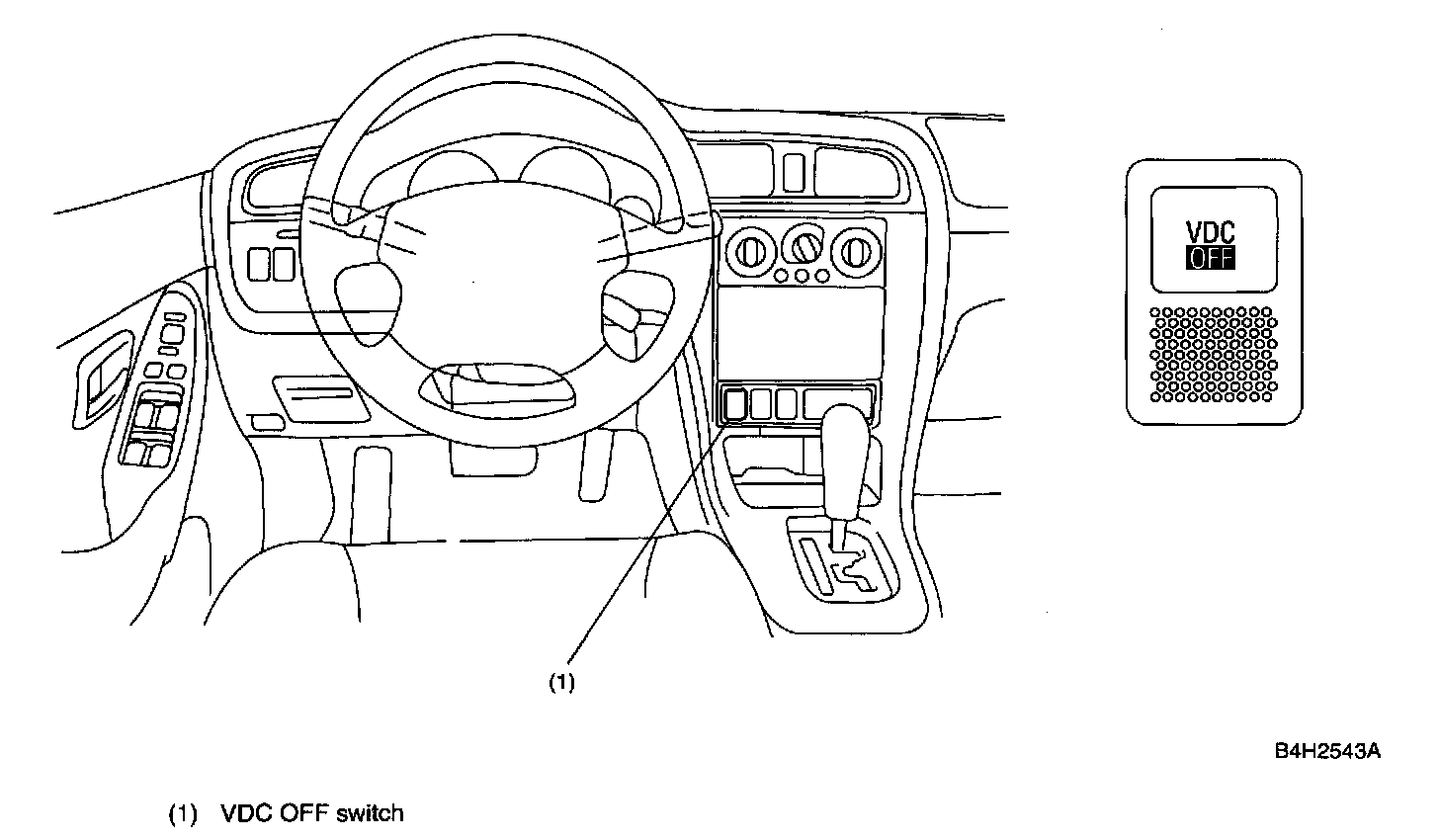 ^ When the VDC OFF switch is pressed while the engine is running, the VDC OFF indicator light in the combination meter illuminates, and VDC control is temporarily disengaged. When the VDC OFF switch is pressed again, the VDC OFF indicator light turns off and the system returns to "engaged" status. ("Temporarily disengaged" status and "engaged" status are altered each time the switch is pressed.)