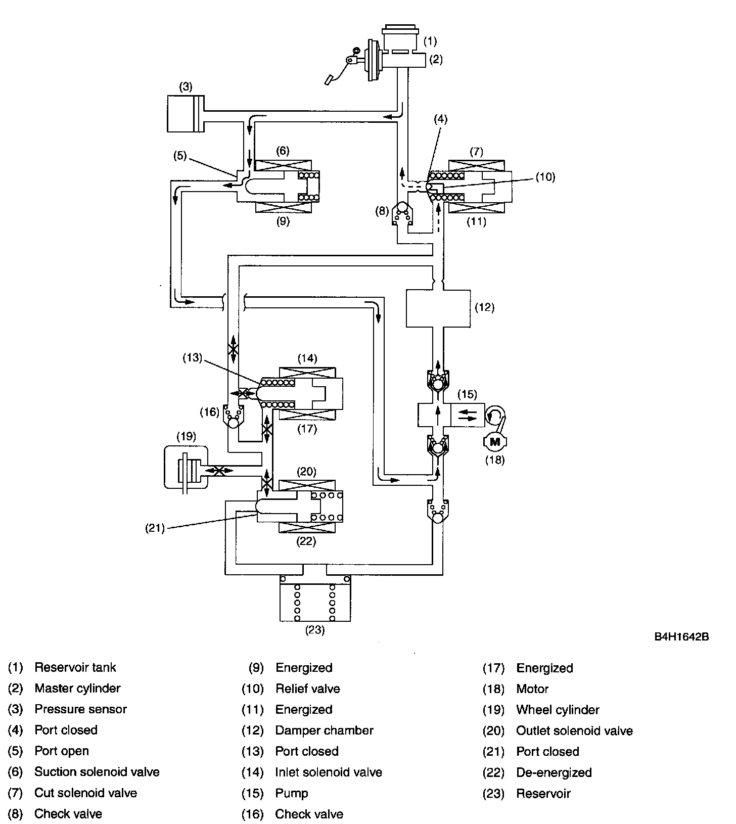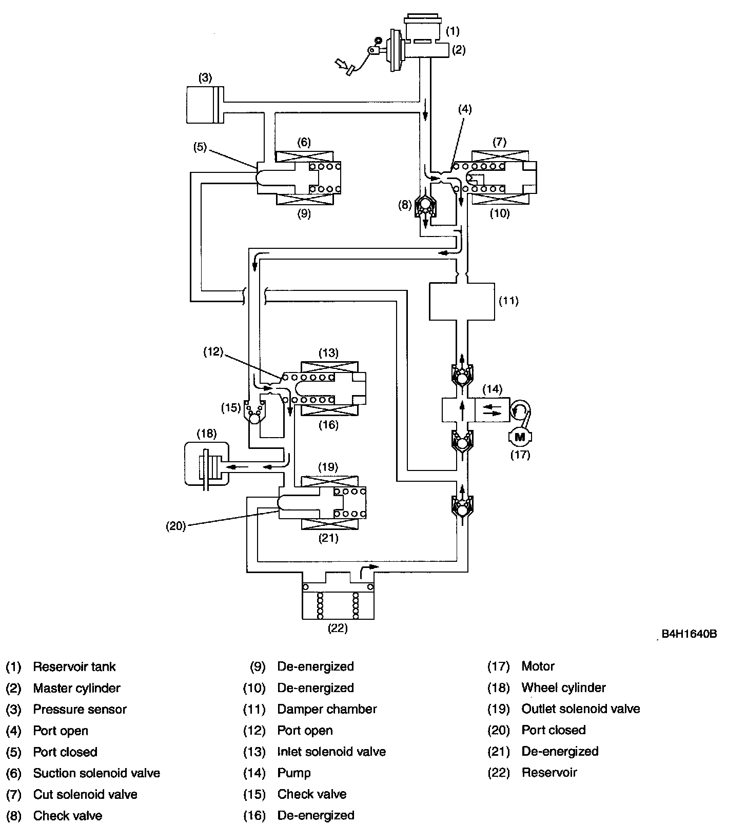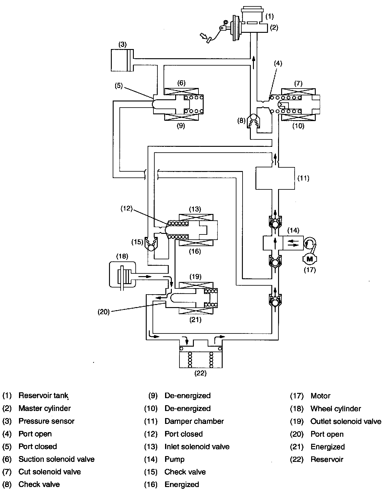 In this state, the pump is activated, forcing the brake fluid in the master cylinder reservoir tank through the open port of the suction solenoid valve. The fluid passage is, however, blocked by the closed inlet solenoid valve. Since the port of the outlet solenoid valve is also closed, the fluid pressure in the wheel cylinder is held unreleased.