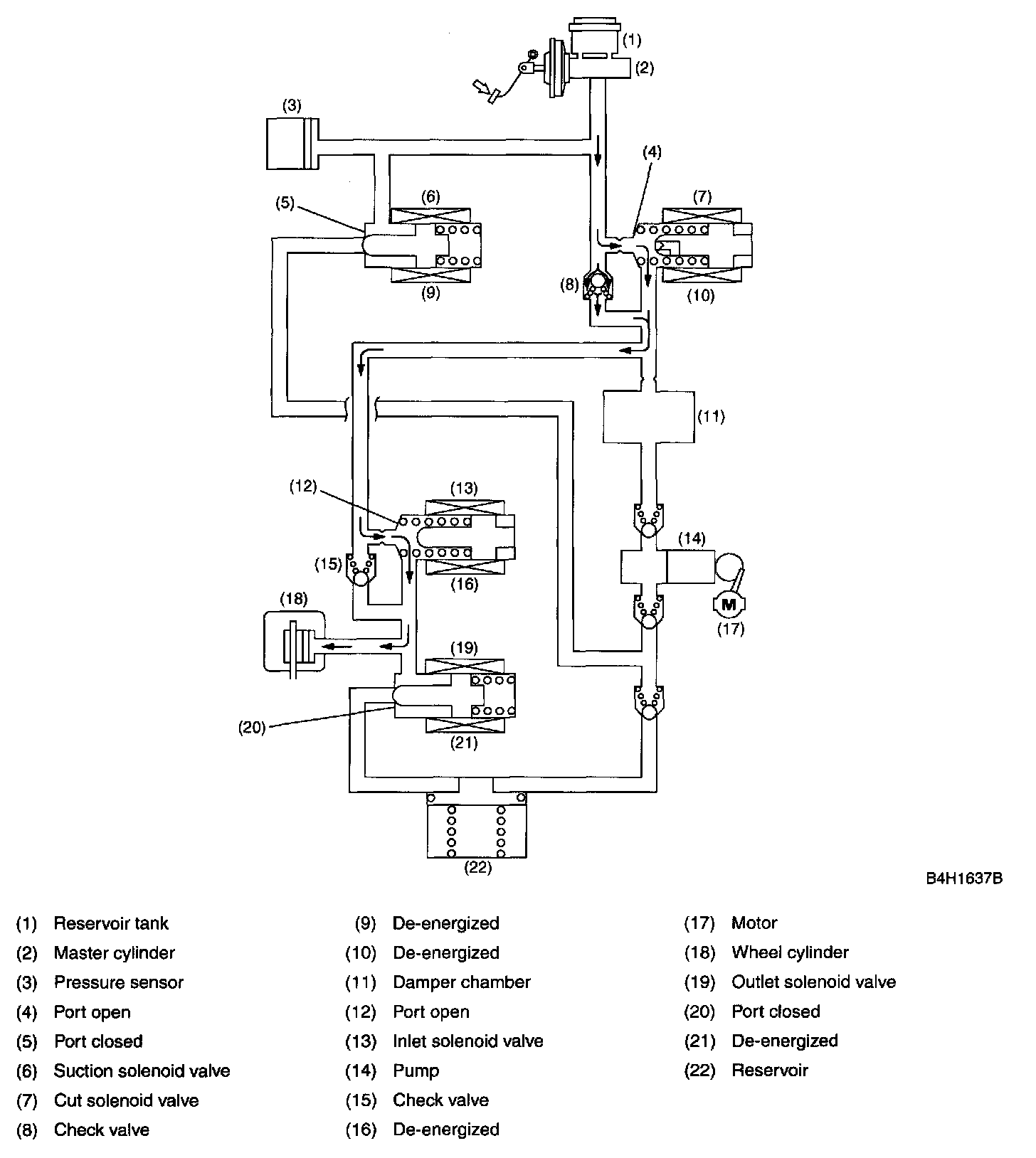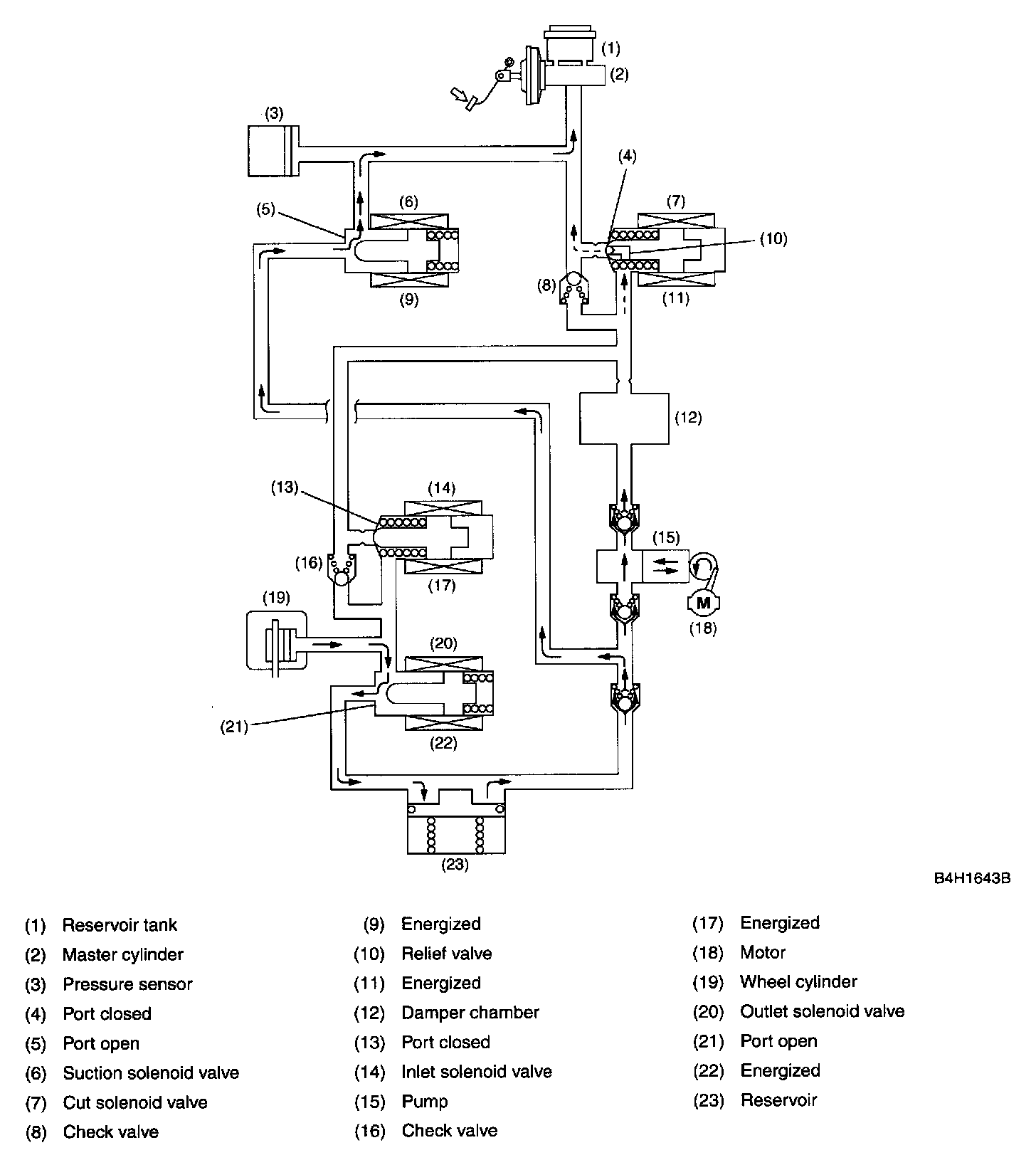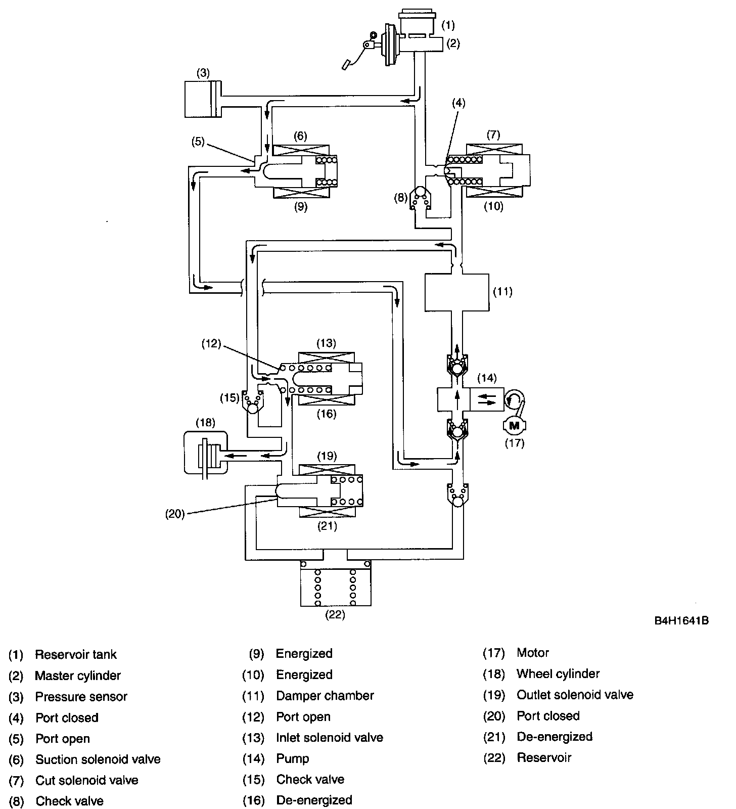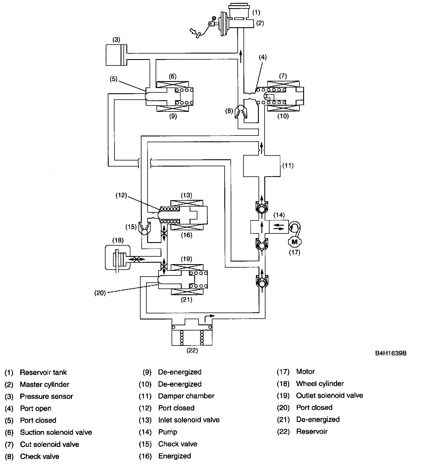In this state, the pump is activated, forcing the brake fluid in the master cylinder reservoir tank through the open port of the suction solenoid valve. The fluid passage is, however, blocked by the closed inlet solenoid valve. Since the port of the outlet solenoid valve is also closed, the fluid pressure in the wheel cylinder is held unreleased.