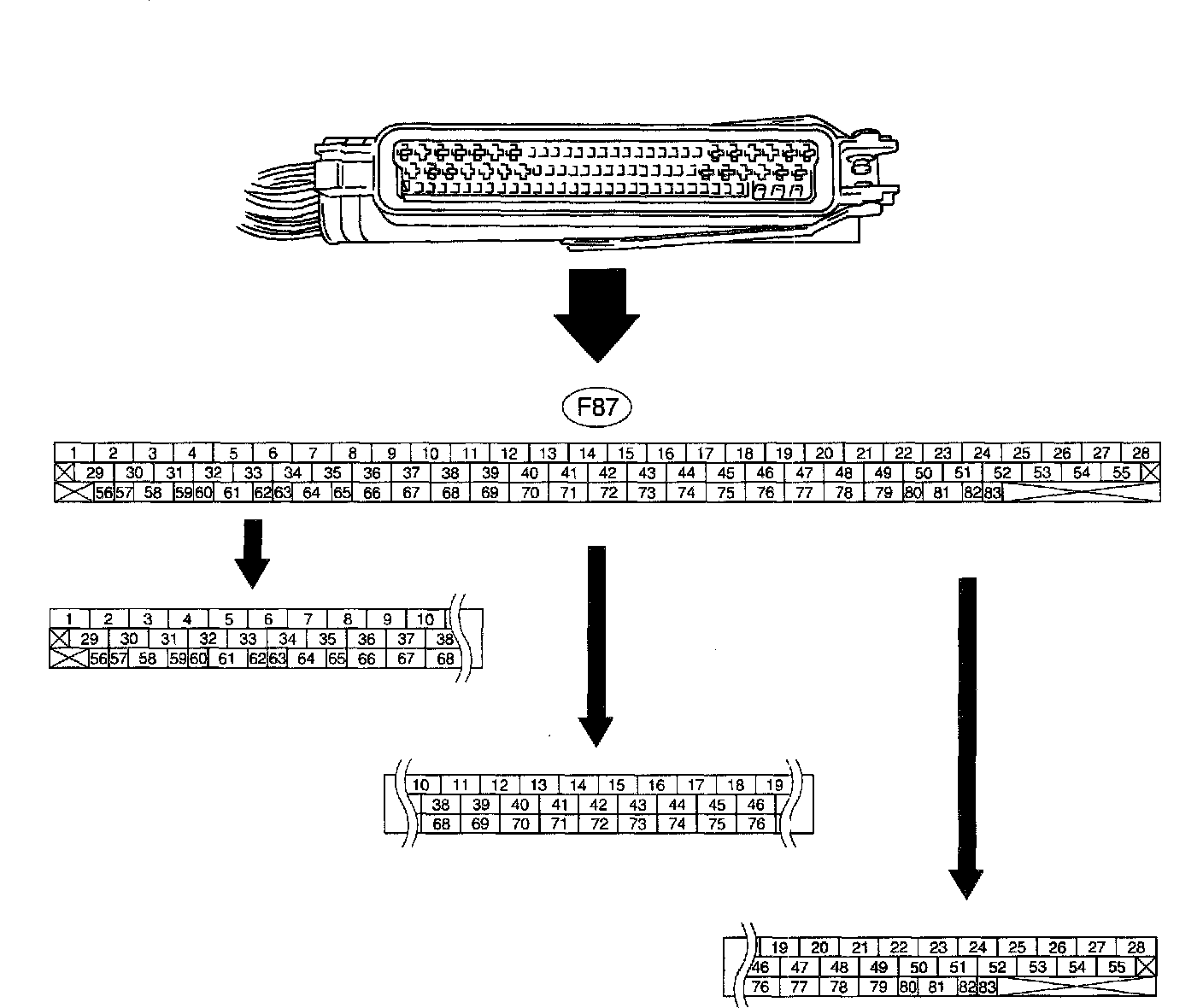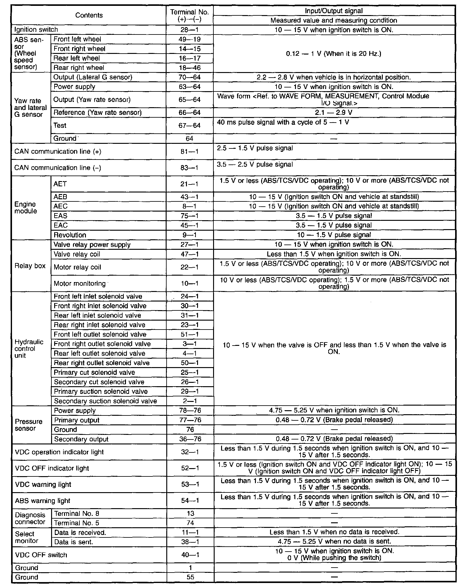 ^ When the connector is removed from the VDCCM, the connector switch closes the circuit between terminal No. 53, No. 54 and No. 55. The ABS and VDC warning light illuminate.