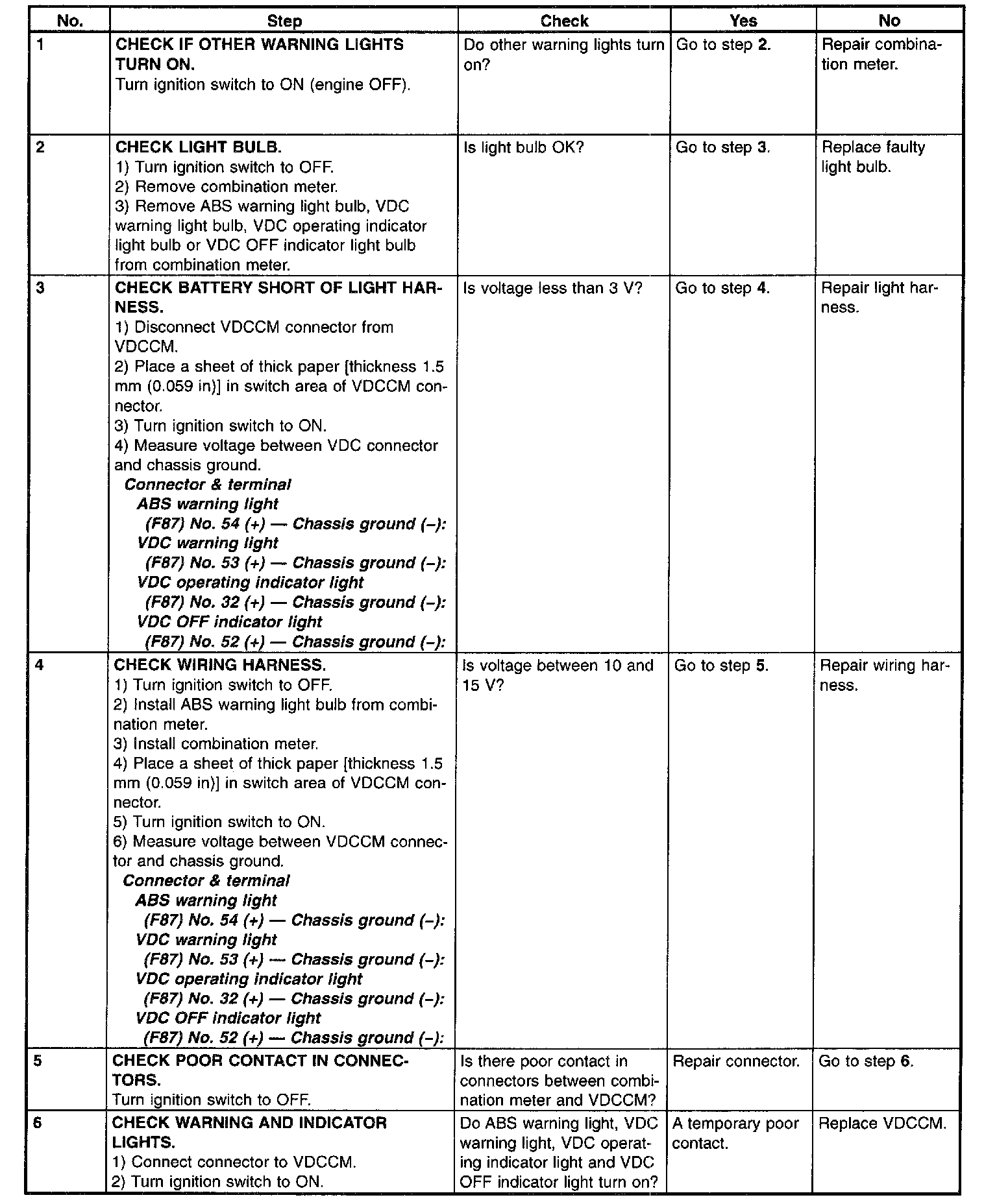 - When ignition switch is turned ON (engine OFF), ABS warning light, VDC warning light, VDC operating indicator light or VDC OFF indicator light does not come on.