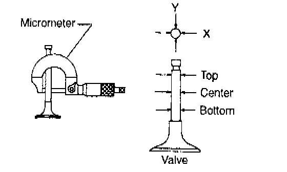 1) Check the clearance between valve guide and stem. The clearance can be checked by measuring the outside diameter of valve stem and the inside diameter of valve guide with outside and inside micrometers respectively.