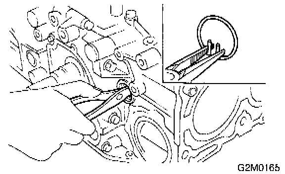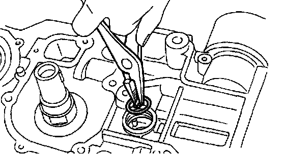 20) Remove oil pump from cylinder block. Use a flat-bladed screwdriver as shown in figure when removing oil pump.