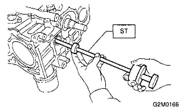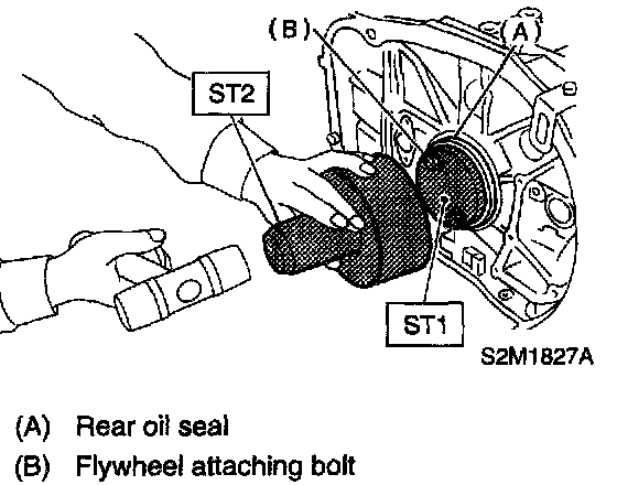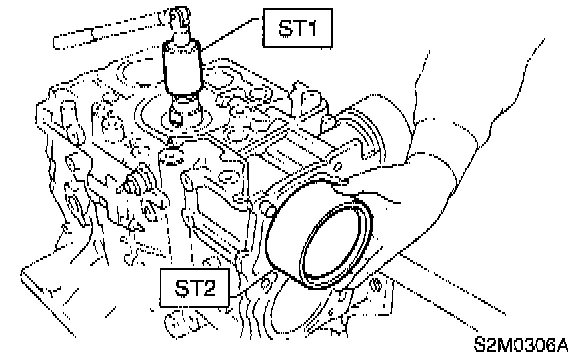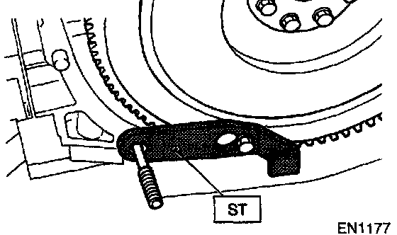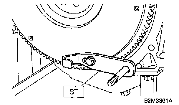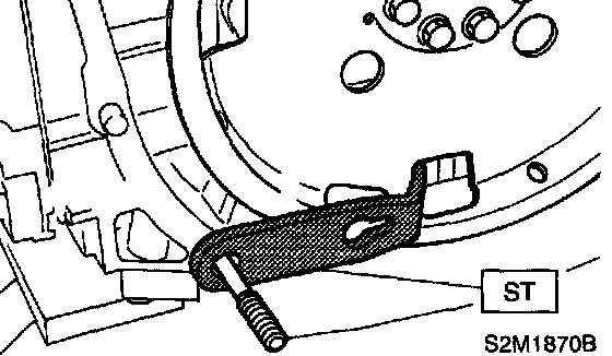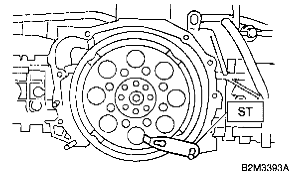 16) Remove flywheel (MT vehicles only) or drive plate (AT vehicles only). Using ST, lock crankshaft.