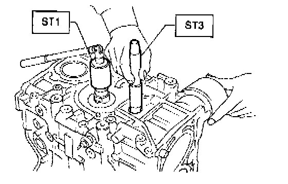 b) Using ST1, turn crankshaft so that #1 and #2 connecting rods are set at bottom dead center.